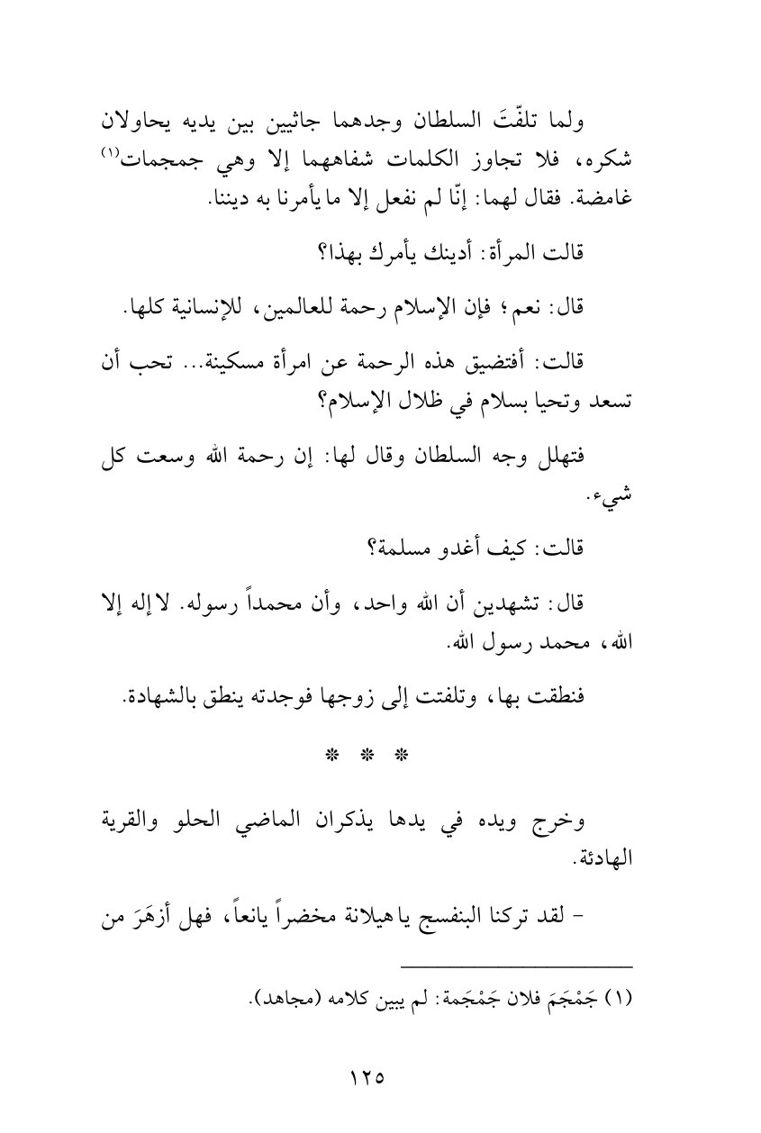ولما تلفّتَ السلطان وجدهما جاثيين بين يديه يحاولان شكره، فلا تجاوز الكلمات شفاههما إلا وهي جمجمات (¬1) غامضة. فقال لهما: إنّا لم نفعل إلا ما يأمرنا به ديننا.