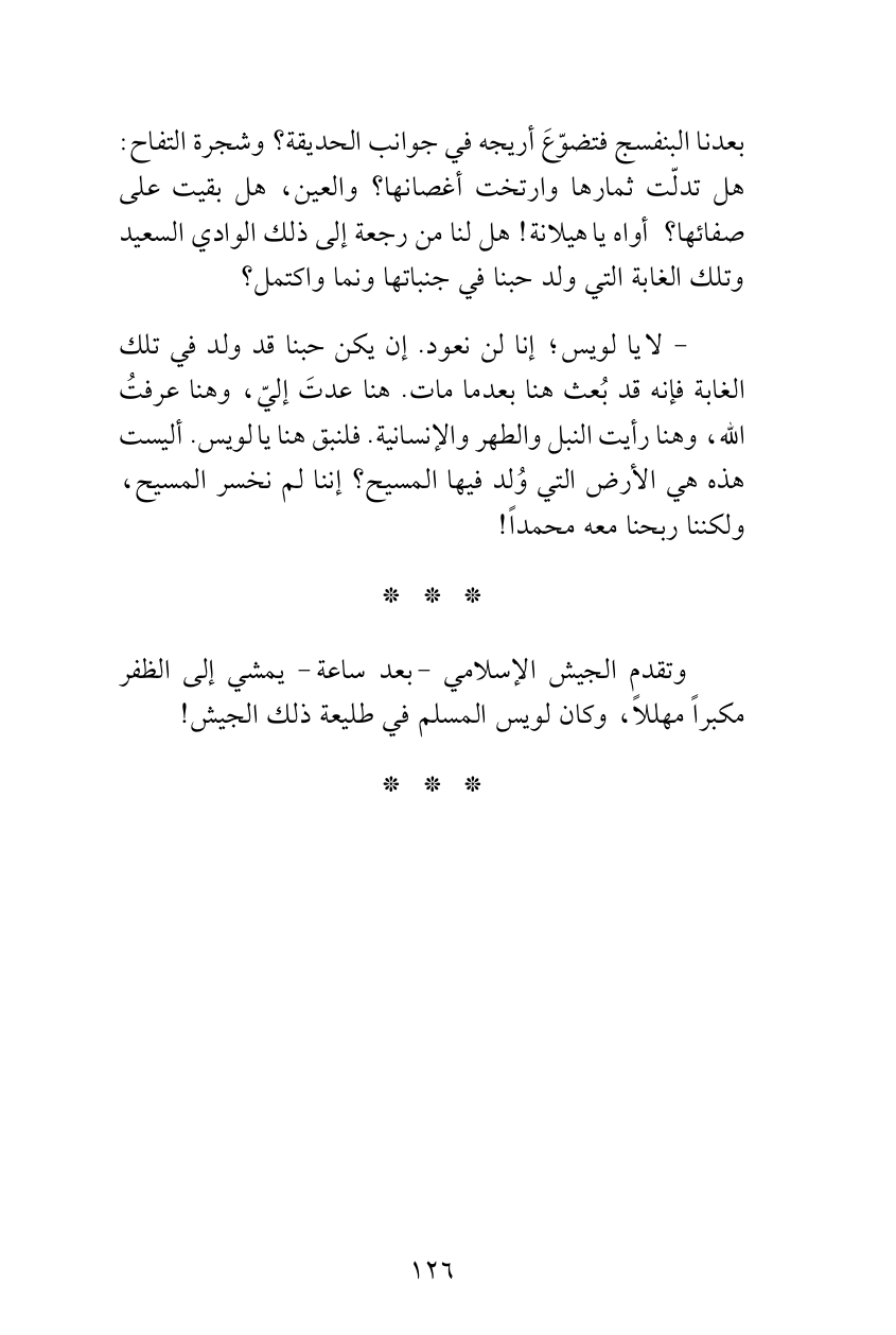 - لا يا لويس؛ إنا لن نعود. إن يكن حبنا قد ولد في تلك الغابة فإنه قد بُعث هنا بعدما مات. هنا عدتَ إليّ، وهنا عرفتُ الله، وهنا رأيت النبل والطهر والإنسانية. فلنبق هنا يا لويس. أليست هذه هي الأرض التي وُلد فيها المسيح؟ إننا لم نخسر المسيح، ولكننا ربحنا معه محمداً!