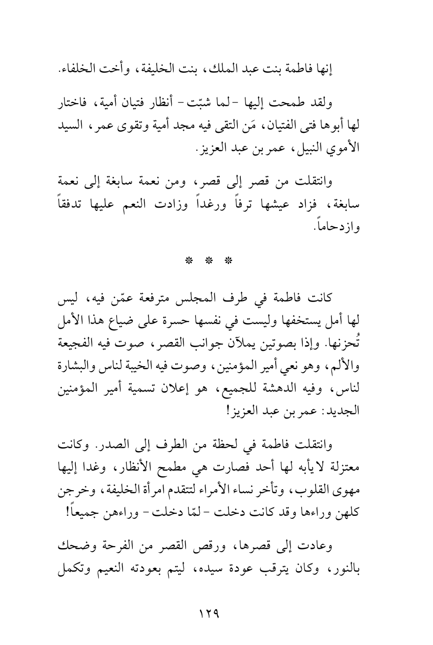 كانت فاطمة في طرف المجلس مترفعة عمّن فيه، ليس لها أمل يستخفها وليست في نفسها حسرة على ضياع هذا الأمل تُحزنها. وإذا بصوتين يملآن جوانب القصر، صوت فيه الفجيعة والألم، وهو نعي أمير المؤمنين، وصوت فيه الخيبة لناس والبشارة لناس، وفيه الدهشة للجميع، هو إعلان تسمية أمير المؤمنين الجديد: عمر بن عبد العزيز!