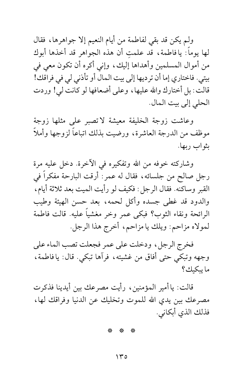 فخرج الرجل، ودخلت على عمر فجعلت تصب الماء على وجهه وتبكي حتى أفاق من غشيته، فرآها تبكي. قال: يا فاطمة، ما يبكيك؟