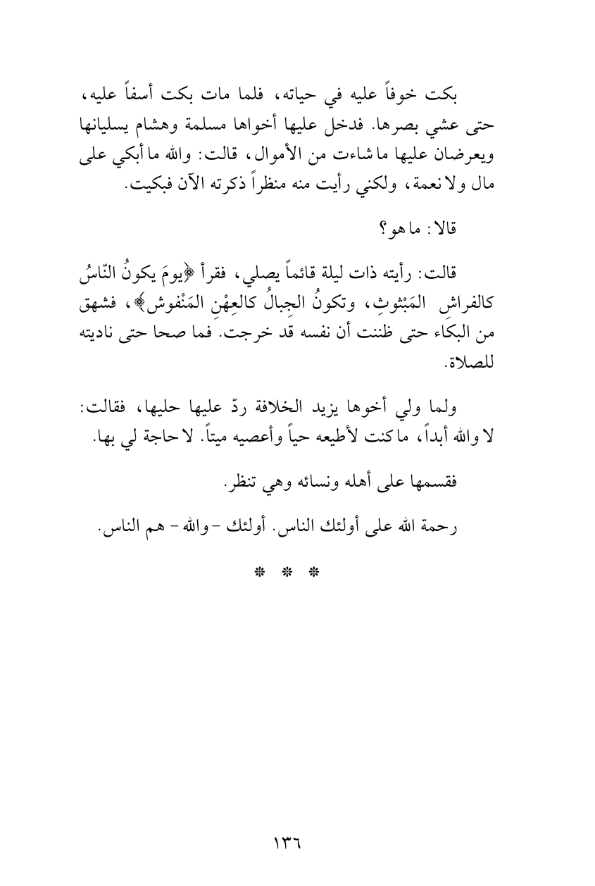 بكت خوفاً عليه في حياته، فلما مات بكت أسفاً عليه، حتى عشي بصرها. فدخل عليها أخواها مسلمة وهشام يسليانها ويعرضان عليها ما شاءت من الأموال، قالت: والله ما أبكي على مال ولا نعمة، ولكني رأيت منه منظراً ذكرته الآن فبكيت.