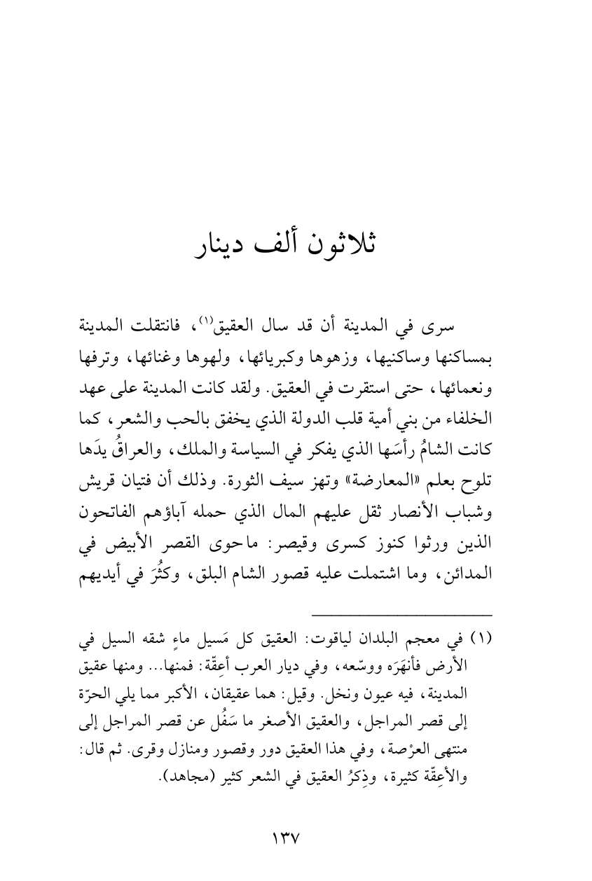 سرى في المدينة أن قد سال العقيق (¬1)، فانتقلت المدينة بمساكنها وساكنيها، وزهوها وكبريائها، ولهوها وغنائها، وترفها ونعمائها، حتى استقرت في العقيق. ولقد كانت المدينة على عهد الخلفاء من بني أمية قلب الدولة الذي يخفق بالحب والشعر، كما كانت الشامُ رأسَها الذي يفكر في السياسة والملك، والعراقُ يدَها تلوح بعلم «المعارضة» وتهز سيف الثورة. وذلك أن فتيان قريش وشباب الأنصار ثقل عليهم المال الذي حمله آباؤهم الفاتحون الذين ورثوا كنوز كسرى وقيصر: ما حوى القصر الأبيض في المدائن، وما اشتملت عليه قصور الشام البلق، وكثُرَ في أيديهم