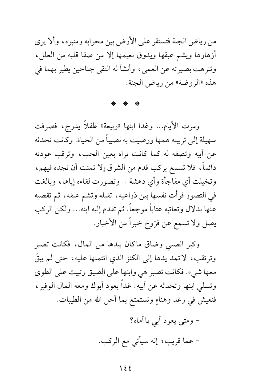 ومرت الأيام ... وغدا ابنها «ربيعة» طفلاً يدرج، فصرفت سهيلة إلى تربيته همها ورضيت به نصيباً من الحياة. وكانت تحدثه عن أبيه وتصفه له كما كانت تراه بعين الحب، وترقب عودته دائماً، فلا تسمع بركب قدم من الشرق إلا تمنت أن تجده فيهم، وتخيلت أي مفاجأة وأي دهشة ... وتصورت لقاءه إياها، وبالغت في التصور فرأت نفسها بين ذراعيه، تقبله وتشم عبقه، ثم تقصيه عنها بدلال وتعاتبه عتاباً موجعاً. ثم تقدم إليه ابنه ... ولكن الركب يصل ولا تسمع عن فرّوخ خبراً من الأخبار.