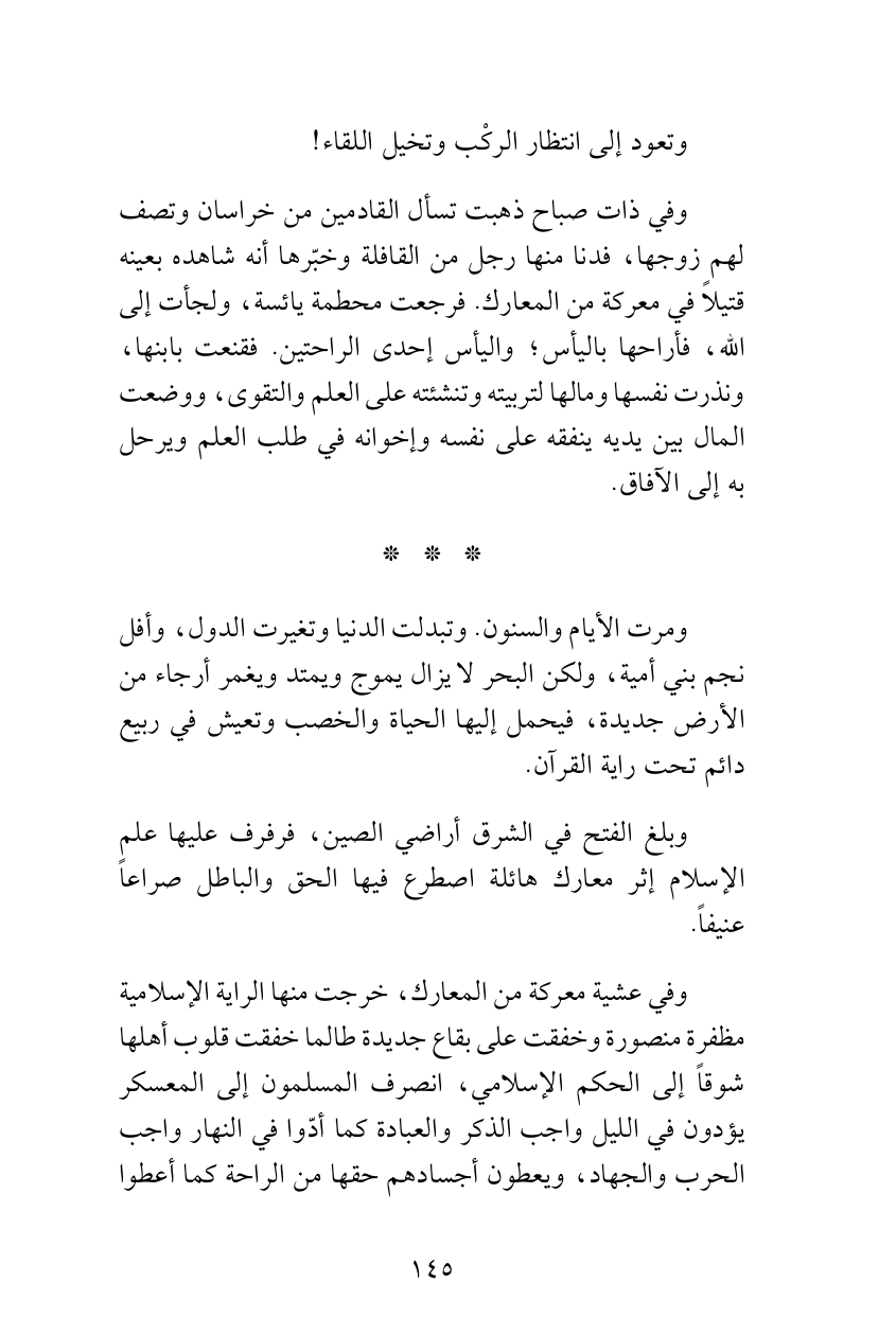 وفي عشية معركة من المعارك، خرجت منها الراية الإسلامية مظفرة منصورة وخفقت على بقاع جديدة طالما خفقت قلوب أهلها شوقاً إلى الحكم الإسلامي، انصرف المسلمون إلى المعسكر يؤدون في الليل واجب الذكر والعبادة كما أدّوا في النهار واجب الحرب والجهاد، ويعطون أجسادهم حقها من الراحة كما أعطوا