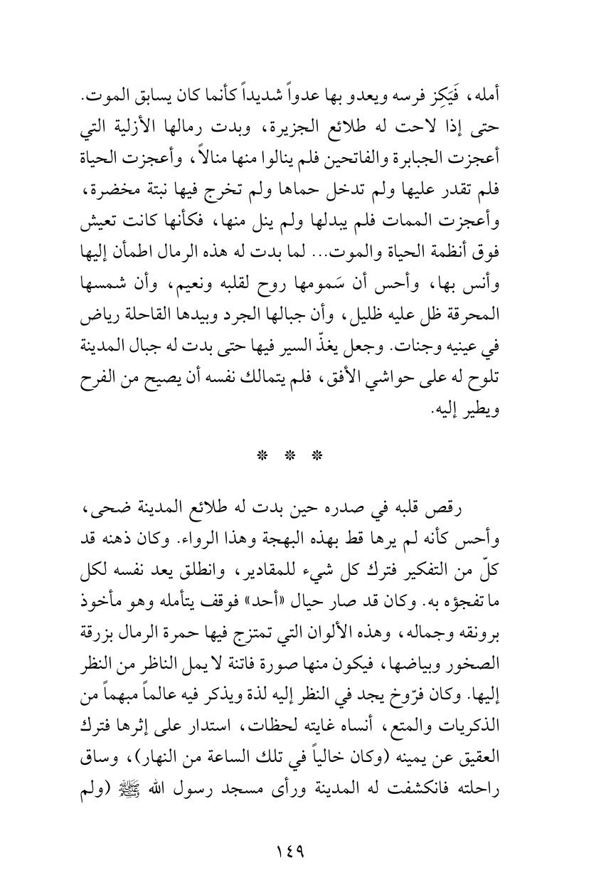 رقص قلبه في صدره حين بدت له طلائع المدينة ضحى، وأحس كأنه لم يرها قط بهذه البهجة وهذا الرواء. وكان ذهنه قد كلّ من التفكير فترك كل شيء للمقادير، وانطلق يعد نفسه لكل ما تفجؤه به. وكان قد صار حيال «أحد» فوقف يتأمله وهو مأخوذ برونقه وجماله، وهذه الألوان التي تمتزج فيها حمرة الرمال بزرقة الصخور وبياضها، فيكون منها صورة فاتنة لا يمل الناظر من النظر إليها. وكان فرّوخ يجد في النظر إليه لذة ويذكر فيه عالماً مبهماً من الذكريات والمتع، أنساه غايته لحظات، استدار على إثرها فترك العقيق عن يمينه (وكان خالياً في تلك الساعة من النهار)، وساق راحلته فانكشفت له المدينة ورأى مسجد رسول الله صلى الله عليه وسلم (ولم