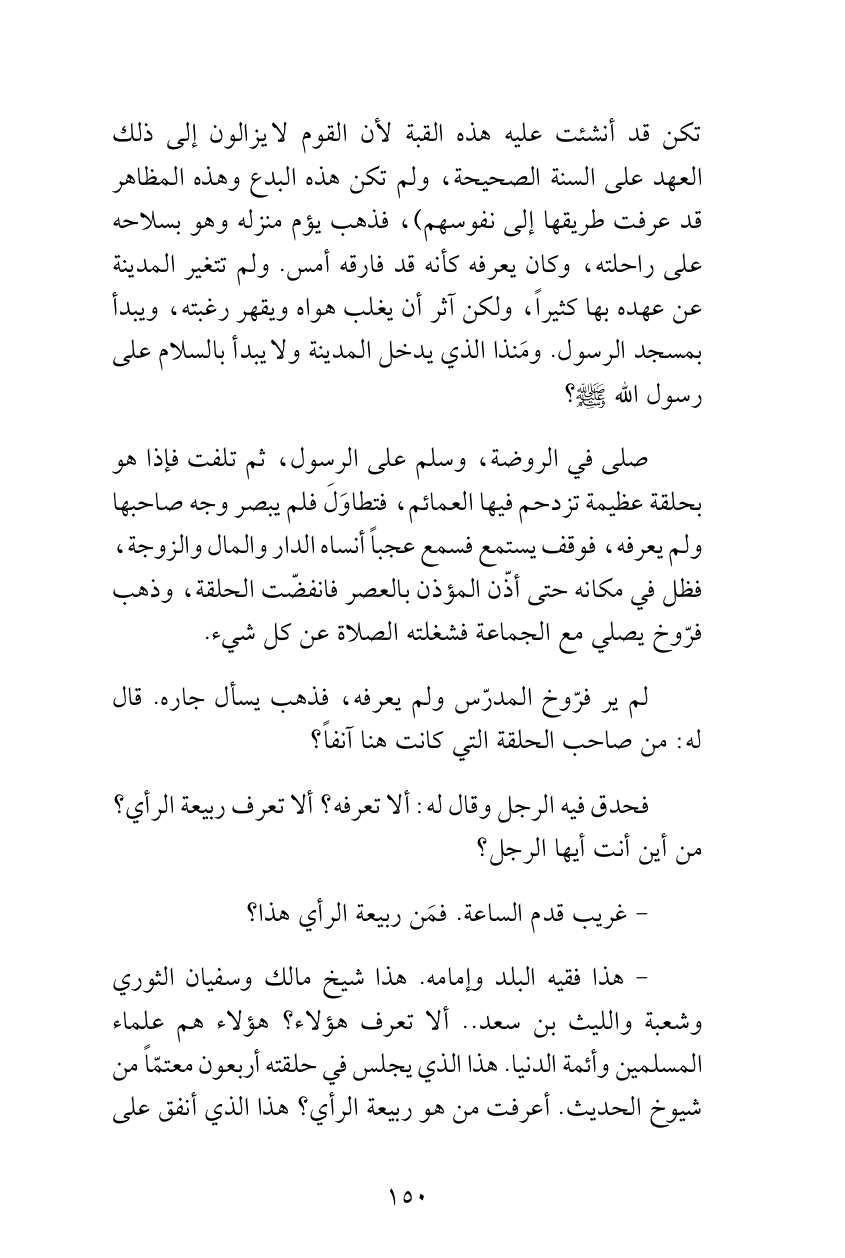 - هذا فقيه البلد وإمامه. هذا شيخ مالك وسفيان الثوري وشعبة والليث بن سعد .. ألا تعرف هؤلاء؟ هؤلاء هم علماء المسلمين وأئمة الدنيا. هذا الذي يجلس في حلقته أربعون معتمّاً من شيوخ الحديث. أعرفت من هو ربيعة الرأي؟ هذا الذي أنفق على
