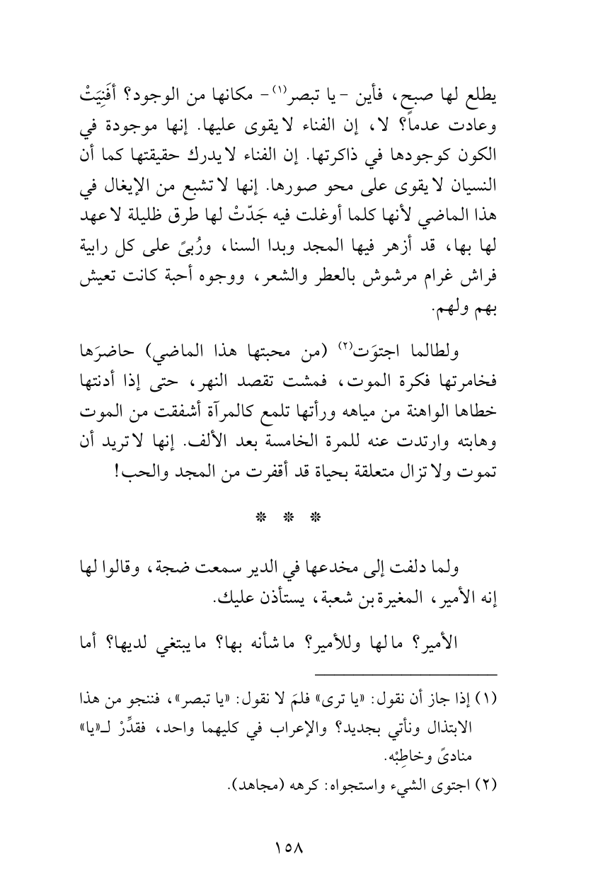 يطلع لها صبح، فأين - يا تبصر (¬1) - مكانها من الوجود؟ أفَنِيَتْ وعادت عدماً؟ لا، إن الفناء لا يقوى عليها. إنها موجودة في الكون كوجودها في ذاكرتها. إن الفناء لا يدرك حقيقتها كما أن النسيان لا يقوى على محو صورها. إنها لا تشبع من الإيغال في هذا الماضي لأنها كلما أوغلت فيه جَدّتْ لها طرق ظليلة لا عهد لها بها، قد أزهر فيها المجد وبدا السنا، ورُبىً على كل رابية فراش غرام مرشوش بالعطر والشعر، ووجوه أحبة كانت تعيش بهم ولهم.