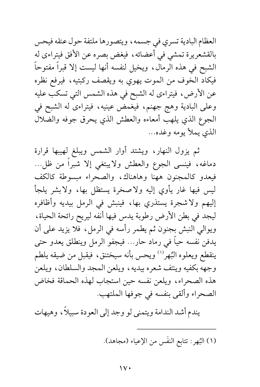 العظام البادية تسري في جسمه، ويتصورها ملتفة حول عنقه فيحس بالقشعريرة تمشي في أعضائه، فيغض بصره عن الأفق فيتراءى له الشبح في هذه الرمال، ويخيل لنفسه أنها ليست إلا قبراً مفتوحاً فيكاد الخوف من الموت يهوي به ويقصف ركبتيه، فيرفع نظره عن الأرض، فيتراءى له الشبح في هذه الشمس التي تسكب عليه وعلى البادية وهج جهنم، فيغمض عينيه، فيتراءى له الشبح في الجوع الذي يلهب أمعاءه والعطش الذي يحرق جوفه والضلال الذي يملأ يومه وغده ...