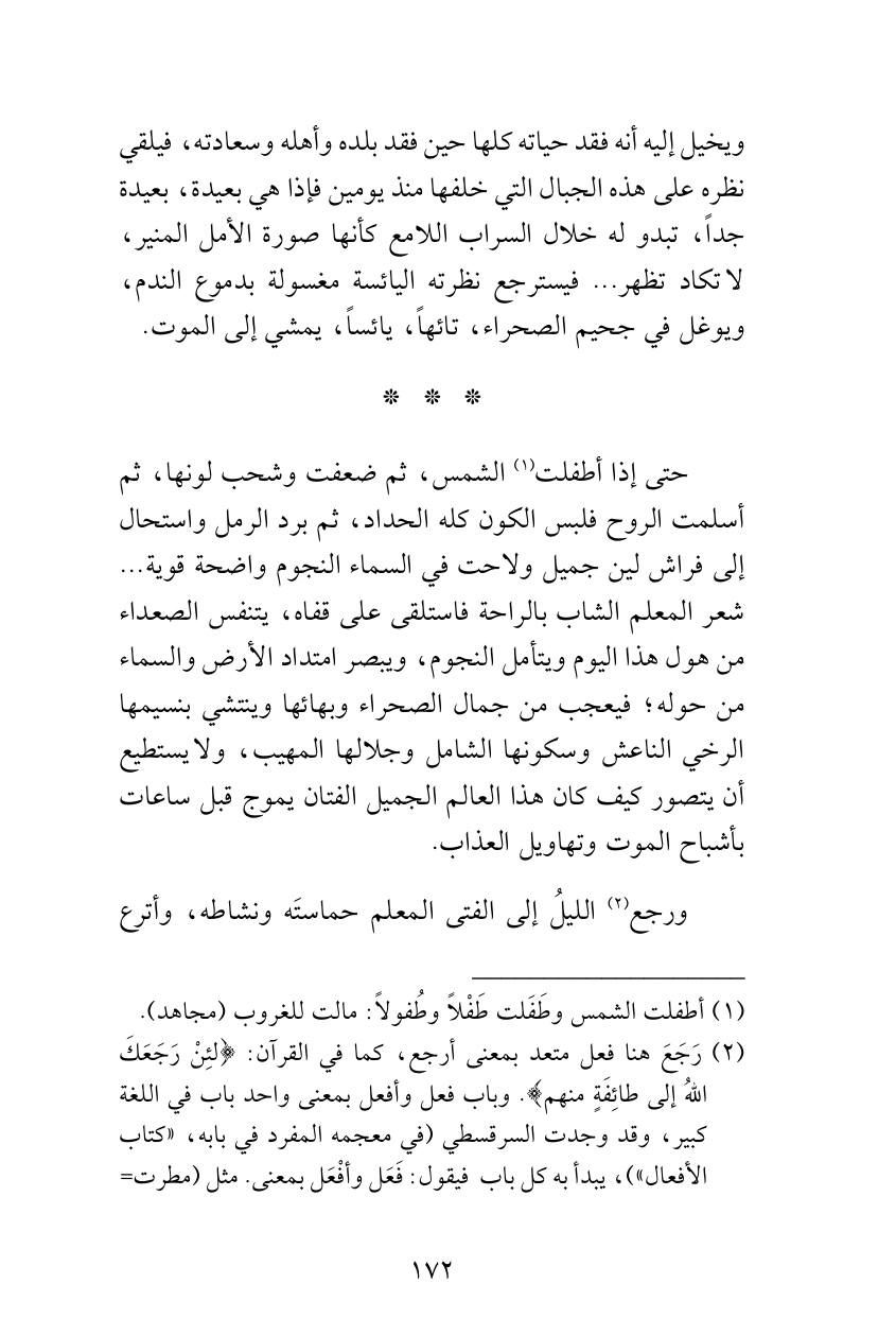 حتى إذا أطفلت (¬1) الشمس، ثم ضعفت وشحب لونها، ثم أسلمت الروح فلبس الكون كله الحداد، ثم برد الرمل واستحال إلى فراش لين جميل ولاحت في السماء النجوم واضحة قوية ... شعر المعلم الشاب بالراحة فاستلقى على قفاه، يتنفس الصعداء من هول هذا اليوم ويتأمل النجوم، ويبصر امتداد الأرض والسماء من حوله؛ فيعجب من جمال الصحراء وبهائها وينتشي بنسيمها الرخي الناعش وسكونها الشامل وجلالها المهيب، ولا يستطيع أن يتصور كيف كان هذا العالم الجميل الفتان يموج قبل ساعات بأشباح الموت وتهاويل العذاب.