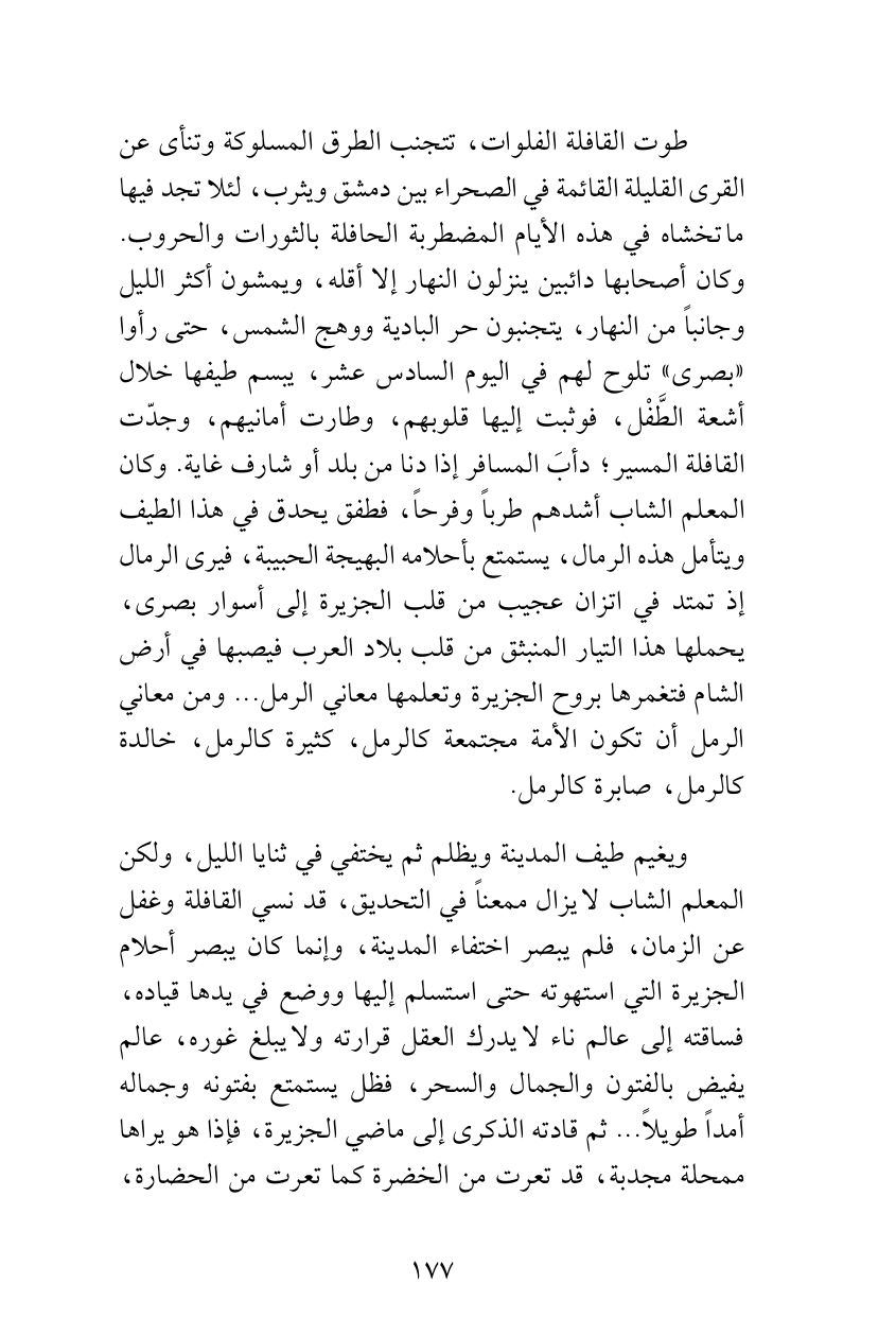 طوت القافلة الفلوات، تتجنب الطرق المسلوكة وتنأى عن القرى القليلة القائمة في الصحراء بين دمشق ويثرب، لئلا تجد فيها ما تخشاه في هذه الأيام المضطربة الحافلة بالثورات والحروب. وكان أصحابها دائبين ينزلون النهار إلا أقله، ويمشون أكثر الليل وجانباً من النهار، يتجنبون حر البادية ووهج الشمس، حتى رأوا «بصرى» تلوح لهم في اليوم السادس عشر، يبسم طيفها خلال أشعة الطَّفْل، فوثبت إليها قلوبهم، وطارت أمانيهم، وجدّت القافلة المسير؛ دأبَ المسافر إذا دنا من بلد أو شارف غاية. وكان المعلم الشاب أشدهم طرباً وفرحاً، فطفق يحدق في هذا الطيف ويتأمل هذه الرمال، يستمتع بأحلامه البهيجة الحبيبة، فيرى الرمال إذ تمتد في اتزان عجيب من قلب الجزيرة إلى أسوار بصرى، يحملها هذا التيار المنبثق من قلب بلاد العرب فيصبها في أرض الشام فتغمرها بروح الجزيرة وتعلمها معاني الرمل ... ومن معاني الرمل أن تكون الأمة مجتمعة كالرمل، كثيرة كالرمل، خالدة كالرمل، صابرة كالرمل.