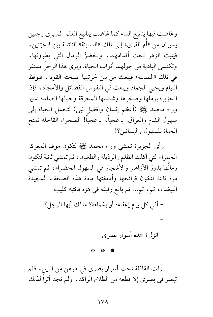 وغاضت فيها ينابيع الماء كما غاضت ينابيع العلم. ثم يرى رجلين يسيران من «أُم القرى» إلى تلك «المدينة» النائمة بين الحرّتين، فينبت الزهر تحت أقدامهما، وتخضرُّ الرمال التي يطؤونها، وتكتسي البادية من حولهما أثواب الحياة. ويرى هذا الرجلَ يستقر في تلك «المدينة» فيبعث من بين حَرّتيها صيحته القوية، فيوقظ النيام ويحيي الجماد ويبعث في النفوس الفضائل والأمجاد، فإذا الجزيرة برملها وصخرها وشمسها المحرقة وجبالها الصلدة تسير وراء محمد صلى الله عليه وسلم (أعظم إنسان وأفضل نبي) لتحمل الحياة إلى سهول الشام والعراق. يا عجباً، يا عجباً! الصحراء القاحلة تمنح الحياة للسهول والبساتين؟!