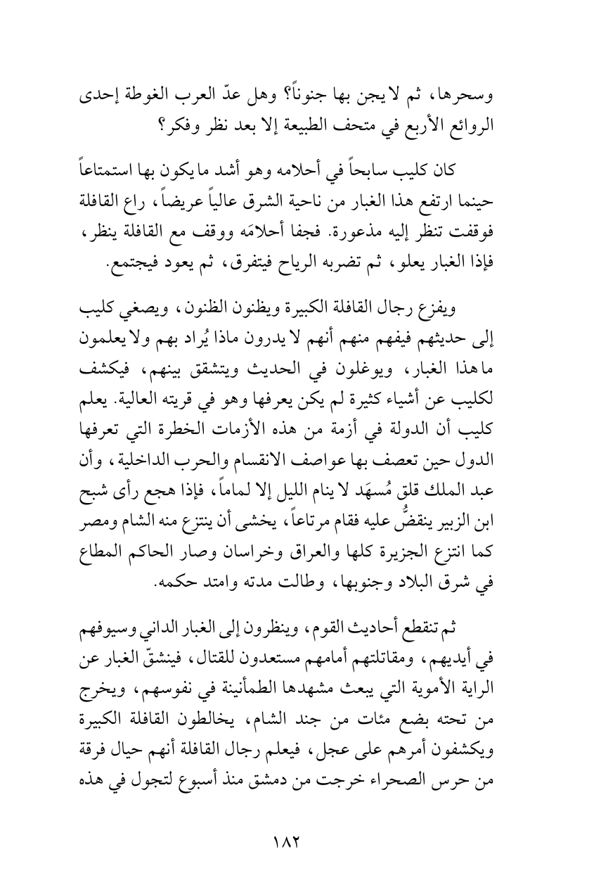 ويفزع رجال القافلة الكبيرة ويظنون الظنون، ويصغي كليب إلى حديثهم فيفهم منهم أنهم لا يدرون ماذا يُراد بهم ولا يعلمون ما هذا الغبار، ويوغلون في الحديث ويتشقق بينهم، فيكشف لكليب عن أشياء كثيرة لم يكن يعرفها وهو في قريته العالية. يعلم كليب أن الدولة في أزمة من هذه الأزمات الخطرة التي تعرفها الدول حين تعصف بها عواصف الانقسام والحرب الداخلية، وأن عبد الملك قلق مُسهَد لا ينام الليل إلا لماماً، فإذا هجع رأى شبح ابن الزبير ينقضُّ عليه فقام مرتاعاً، يخشى أن ينتزع منه الشام ومصر كما انتزع الجزيرة كلها والعراق وخراسان وصار الحاكم المطاع في شرق البلاد وجنوبها، وطالت مدته وامتد حكمه.