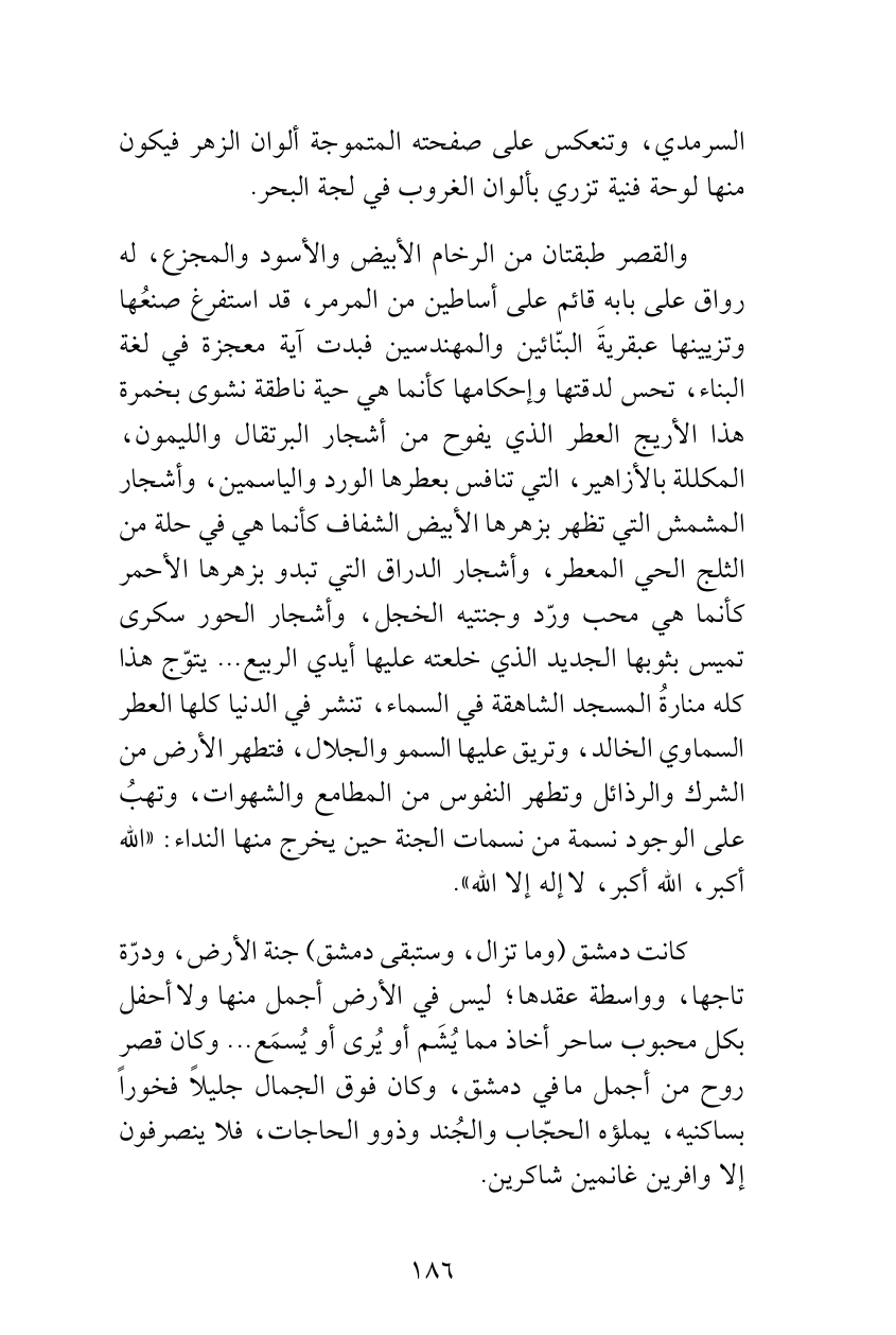 والقصر طبقتان من الرخام الأبيض والأسود والمجزع، له رواق على بابه قائم على أساطين من المرمر، قد استفرغ صنعُها وتزيينها عبقريةَ البنّائين والمهندسين فبدت آية معجزة في لغة البناء، تحس لدقتها وإحكامها كأنما هي حية ناطقة نشوى بخمرة هذا الأريج العطر الذي يفوح من أشجار البرتقال والليمون، المكللة بالأزاهير، التي تنافس بعطرها الورد والياسمين، وأشجار المشمش التي تظهر بزهرها الأبيض الشفاف كأنما هي في حلة من الثلج الحي المعطر، وأشجار الدراق التي تبدو بزهرها الأحمر كأنما هي محب ورّد وجنتيه الخجل، وأشجار الحور سكرى تميس بثوبها الجديد الذي خلعته عليها أيدي الربيع ... يتوّج هذا كله منارةُ المسجد الشاهقة في السماء، تنشر في الدنيا كلها العطر السماوي الخالد، وتريق عليها السمو والجلال، فتطهر الأرض من الشرك والرذائل وتطهر النفوس من المطامع والشهوات، وتهبُ على الوجود نسمة من نسمات الجنة حين يخرج منها النداء: «الله أكبر، الله أكبر، لا إله إلا الله».