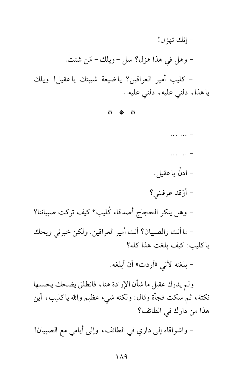 ولم يدرك عقيل ما شأن الإرادة هنا، فانطلق يضحك يحسبها نكتة، ثم سكت فجأة وقال: ولكنه شيء عظيم والله يا كليب، أين هذا من دارك في الطائف؟