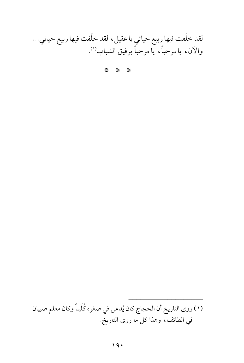 لقد خلّفت فيها ربيع حياتي يا عقيل، لقد خلّفت فيها ربيع حياتي ... والآن، يا مرحباً، يا مرحباً برفيق الشباب (¬1).