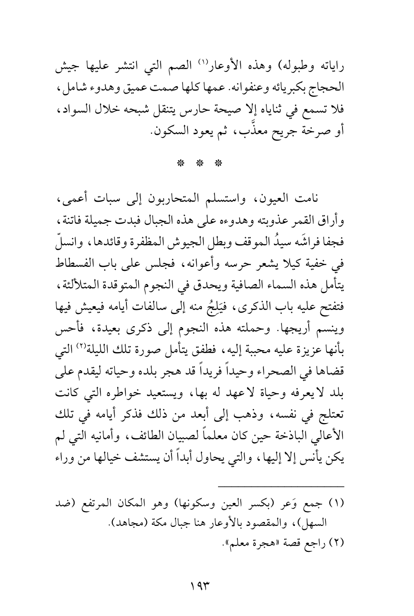 نامت العيون، واستسلم المتحاربون إلى سبات أعمى، وأراق القمر عذوبته وهدوءه على هذه الجبال فبدت جميلة فاتنة، فجفا فراشَه سيدُ الموقف وبطل الجيوش المظفرة وقائدها، وانسلّ في خفية كيلا يشعر حرسه وأعوانه، فجلس على باب الفسطاط يتأمل هذه السماء الصافية ويحدق في النجوم المتوقدة المتلألئة، فتفتح عليه باب الذكرى، فيَلِجُ منه إلى سالفات أيامه فيعيش فيها وينسم أريجها. وحملته هذه النجوم إلى ذكرى بعيدة، فأحس بأنها عزيزة عليه محببة إليه، فطفق يتأمل صورة تلك الليلة (¬2) التي قضاها في الصحراء وحيداً فريداً قد هجر بلده وحياته ليقدم على بلد لا يعرفه وحياة لا عهد له بها، ويستعيد خواطره التي كانت تعتلج في نفسه، وذهب إلى أبعد من ذلك فذكر أيامه في تلك الأعالي الباذخة حين كان معلماً لصبيان الطائف، وأمانيه التي لم يكن يأنس إلا إليها، والتي يحاول أبداً أن يستشف خيالها من وراء