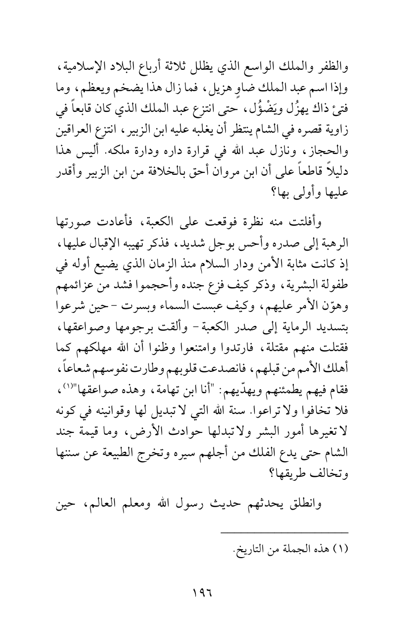 وأفلتت منه نظرة فوقعت على الكعبة، فأعادت صورتها الرهبة إلى صدره وأحس بوجل شديد، فذكر تهيبه الإقبال عليها، إذ كانت مثابة الأمن ودار السلام منذ الزمان الذي يضيع أوله في طفولة البشرية، وذكر كيف فزع جنده وأحجموا فشد من عزائمهم وهوّن الأمر عليهم، وكيف عبست السماء وبسرت - حين شرعوا بتسديد الرماية إلى صدر الكعبة - وألقت برجومها وصواعقها، فقتلت منهم مقتلة، فارتدوا وامتنعوا وظنوا أن الله مهلكهم كما أهلك الأمم من قبلهم، فانصدعت قلوبهم وطارت نفوسهم شعاعاً، فقام فيهم يطمئنهم ويهدّيهم: "أنا ابن تهامة، وهذه صواعقها" (¬1)، فلا تخافوا ولا تراعوا. سنة الله التي لا تبديل لها وقوانينه في كونه لا تغيرها أمور البشر ولا تبدلها حوادث الأرض، وما قيمة جند الشام حتى يدع الفلك من أجلهم سيره وتخرج الطبيعة عن سننها وتخالف طريقها؟