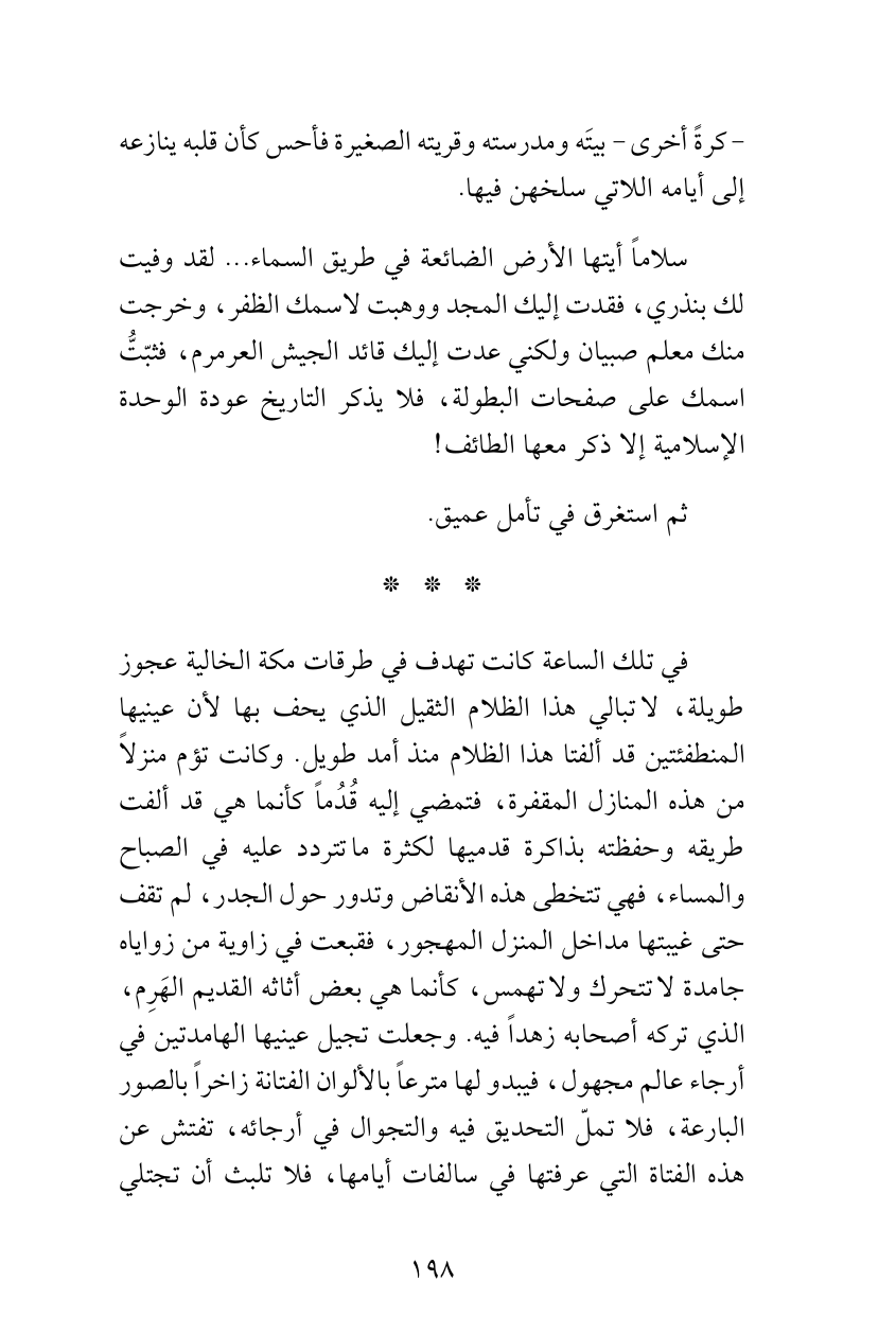في تلك الساعة كانت تهدف في طرقات مكة الخالية عجوز طويلة، لا تبالي هذا الظلام الثقيل الذي يحف بها لأن عينيها المنطفئتين قد ألفتا هذا الظلام منذ أمد طويل. وكانت تؤم منزلاً من هذه المنازل المقفرة، فتمضي إليه قُدُماً كأنما هي قد ألفت طريقه وحفظته بذاكرة قدميها لكثرة ما تتردد عليه في الصباح والمساء، فهي تتخطى هذه الأنقاض وتدور حول الجدر، لم تقف حتى غيبتها مداخل المنزل المهجور، فقبعت في زاوية من زواياه جامدة لا تتحرك ولا تهمس، كأنما هي بعض أثاثه القديم الهَرِم، الذي تركه أصحابه زهداً فيه. وجعلت تجيل عينيها الهامدتين في أرجاء عالم مجهول، فيبدو لها مترعاً بالألوان الفتانة زاخراً بالصور البارعة، فلا تملّ التحديق فيه والتجوال في أرجائه، تفتش عن هذه الفتاة التي عرفتها في سالفات أيامها، فلا تلبث أن تجتلي