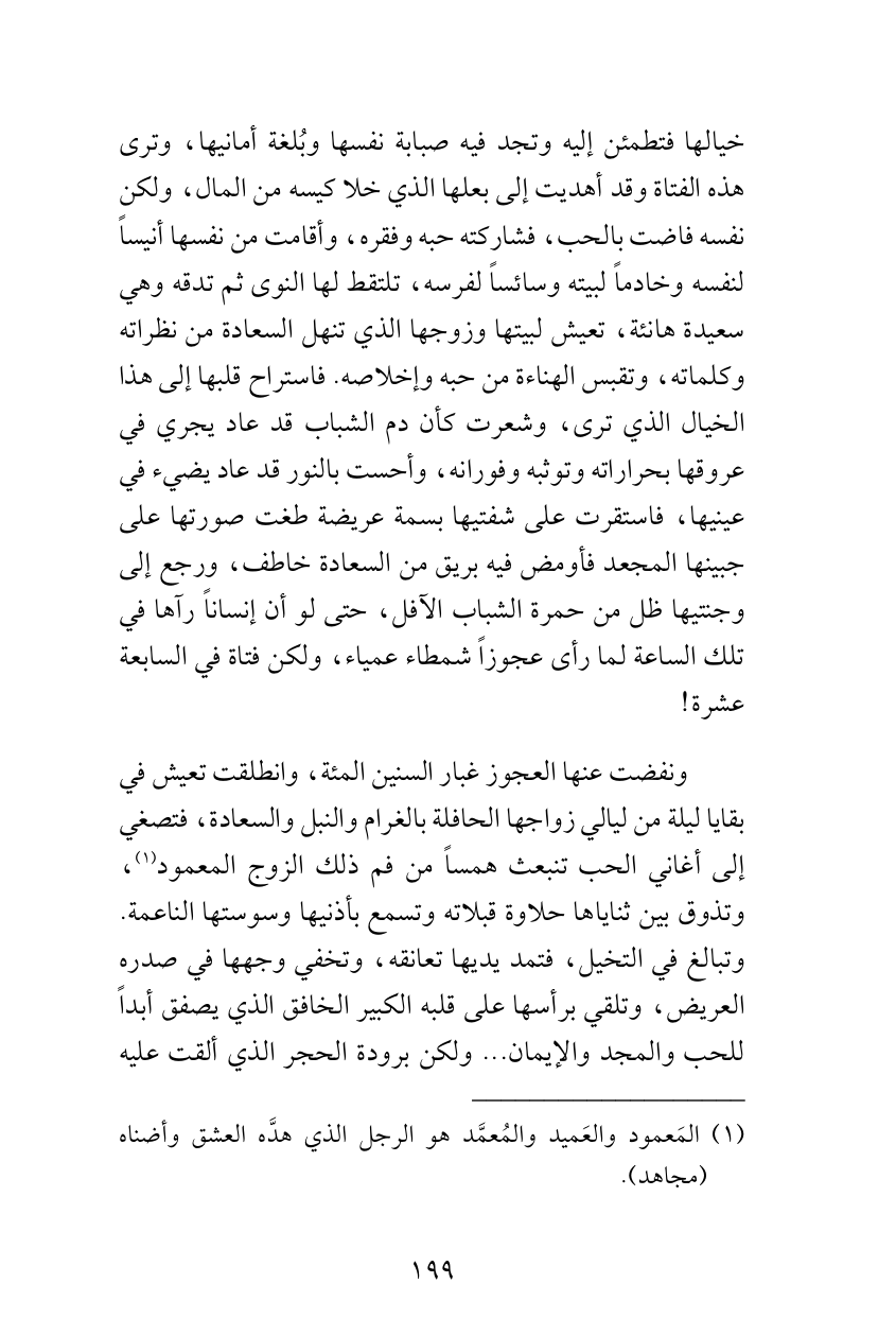 خيالها فتطمئن إليه وتجد فيه صبابة نفسها وبُلغة أمانيها، وترى هذه الفتاة وقد أهديت إلى بعلها الذي خلا كيسه من المال، ولكن نفسه فاضت بالحب، فشاركته حبه وفقره، وأقامت من نفسها أنيساً لنفسه وخادماً لبيته وسائساً لفرسه، تلتقط لها النوى ثم تدقه وهي سعيدة هانئة، تعيش لبيتها وزوجها الذي تنهل السعادة من نظراته وكلماته، وتقبس الهناءة من حبه وإخلاصه. فاستراح قلبها إلى هذا الخيال الذي ترى، وشعرت كأن دم الشباب قد عاد يجري في عروقها بحراراته وتوثبه وفورانه، وأحست بالنور قد عاد يضيء في عينيها، فاستقرت على شفتيها بسمة عريضة طغت صورتها على جبينها المجعد فأومض فيه بريق من السعادة خاطف، ورجع إلى وجنتيها ظل من حمرة الشباب الآفل، حتى لو أن إنساناً رآها في تلك الساعة لما رأى عجوزاً شمطاء عمياء، ولكن فتاة في السابعة عشرة!