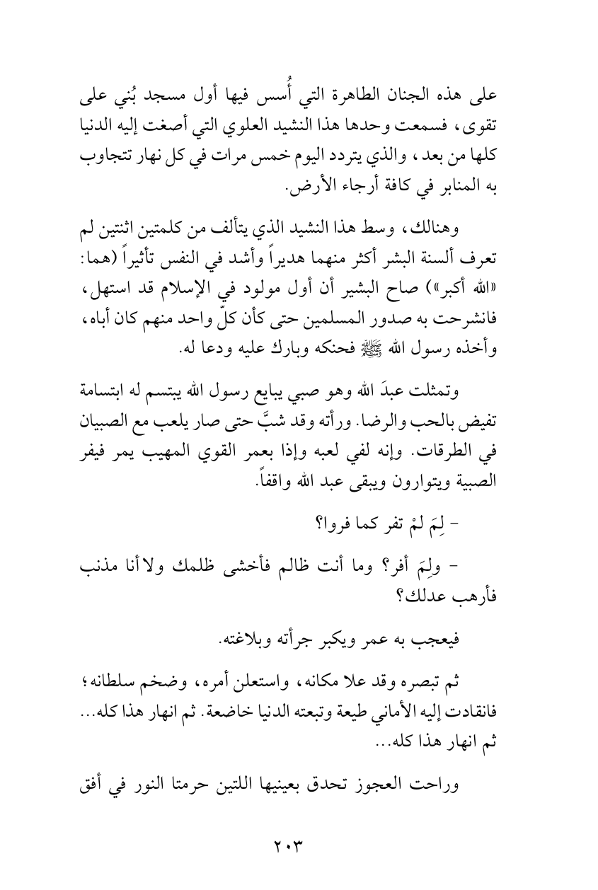 وتمثلت عبدَ الله وهو صبي يبايع رسول الله يبتسم له ابتسامة تفيض بالحب والرضا. ورأته وقد شبَّ حتى صار يلعب مع الصبيان في الطرقات. وإنه لفي لعبه وإذا بعمر القوي المهيب يمر فيفر الصبية ويتوارون ويبقى عبد الله واقفاً.