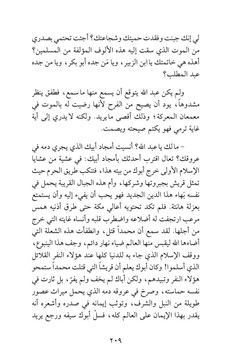 - ما لك يا عبد الله؟ أنسيت أمجاد أبيك الذي يجري دمه في عروقك؟ تعال اقترب أحدثك بأمجاد أبيك: في عشية من عشايا الإسلام الأولى خرج أبوك من بيته هذا، فتنكب طريق الحرم حيث تمثل قريش بجبروتها وشركها، وأم هذه الجبال القريبة يحمل في نفسه بَهاء هذا الدين الجديد فهو يحب أن يفيء إليه وأن يستمتع بعزلة هانئة. فلم تكد تحتويه أعالي مكة حتى طرق أذنيه همس مرعب ارتجفت له أضلاعه واضطرب قلبه وأنساه غايته التي خرج من أجلها. لقد سمع أن محمداً قتل، وانطفأت هذه الشعلة التي أضاءها الله ليقبس منها العالم ضياء نهار دائم، وجف هذا الينبوع، ووقف الإسلام الذي جاء به للدنيا كلها عند هؤلاء النفر القلائل الذي أسلموا! وكان أبوك يعلم أن قريشاً التي قتلت محمداً ستمحو هؤلاء النفر وتبيدهم، ولكن أباك لم يخف ولم يفرّ، بل ثارت في نفسه حماسته، وصرخ في عروقه دمه الذي يحمل ميراث عصور طويلة من النبل والشرف، وتوثب إيمانه في صدره وأشعره أنه يقدر بهذا الإيمان على العالم كله، فسلّ أبوك سيفه ورجع يريد