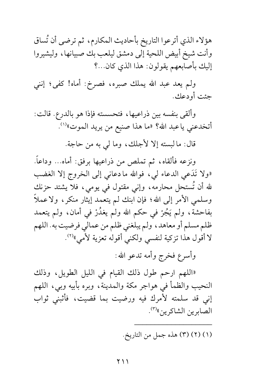 ونزعه فألقاه، ثم تملص من ذراعيها برفق: أماه ... وداعاً. «ولا تَدَعي الدعاء لي، فوالله ما دعاني إلى الخروج إلا الغضب لله أن تُستحل محارمه، وإني مقتول في يومي، فلا يشتد حزنك وسلمي الأمر إلى الله؛ فإن ابنك لم يتعمد إيثار منكر، ولا عملاً بفاحشة، ولم يَجُرْ في حكم الله ولم يغدُرْ في أمان، ولم يتعمد ظلم مسلم أو معاهد، ولم يبلغني ظلم من عمالي فرضيت به. اللهم لا أقول هذا تزكية لنفسي ولكني أقوله تعزية لأمي» (2).