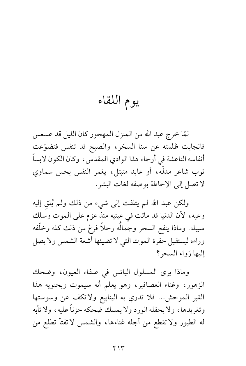 لمّا خرج عبد الله من المنزل المهجور كان الليل قد عسعس فانجابت ظلمته عن سنا السحَر، والصبح قد تنفس فتضوّعت أنفاسه الناعشة في أرجاء هذا الوادي المقدس، وكان الكون لابساً ثوب شاعر مدلّه، أو عابد متبتل، يغمر النفس بحس سماوي لا تصل إلى الإحاطة بوصفه لغات البشر.