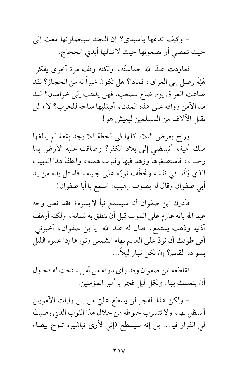فعاودت عبدَ الله حماستُه، ولكنه وقف مرة أخرى يفكر: هَبْهُ وصل إلى العراق، فماذا؟ هل تكون خيراً له من الحجاز؟ لقد ضاعت العراق يوم ضاع مصعب. فهل يذهب إلى خراسان؟ لقد مد الأمن رواقه على هذه المدن، أفيقلبها ساحة للحرب؟ لا، لن يقتل الآلاف من المسلمين ليعيش هو!