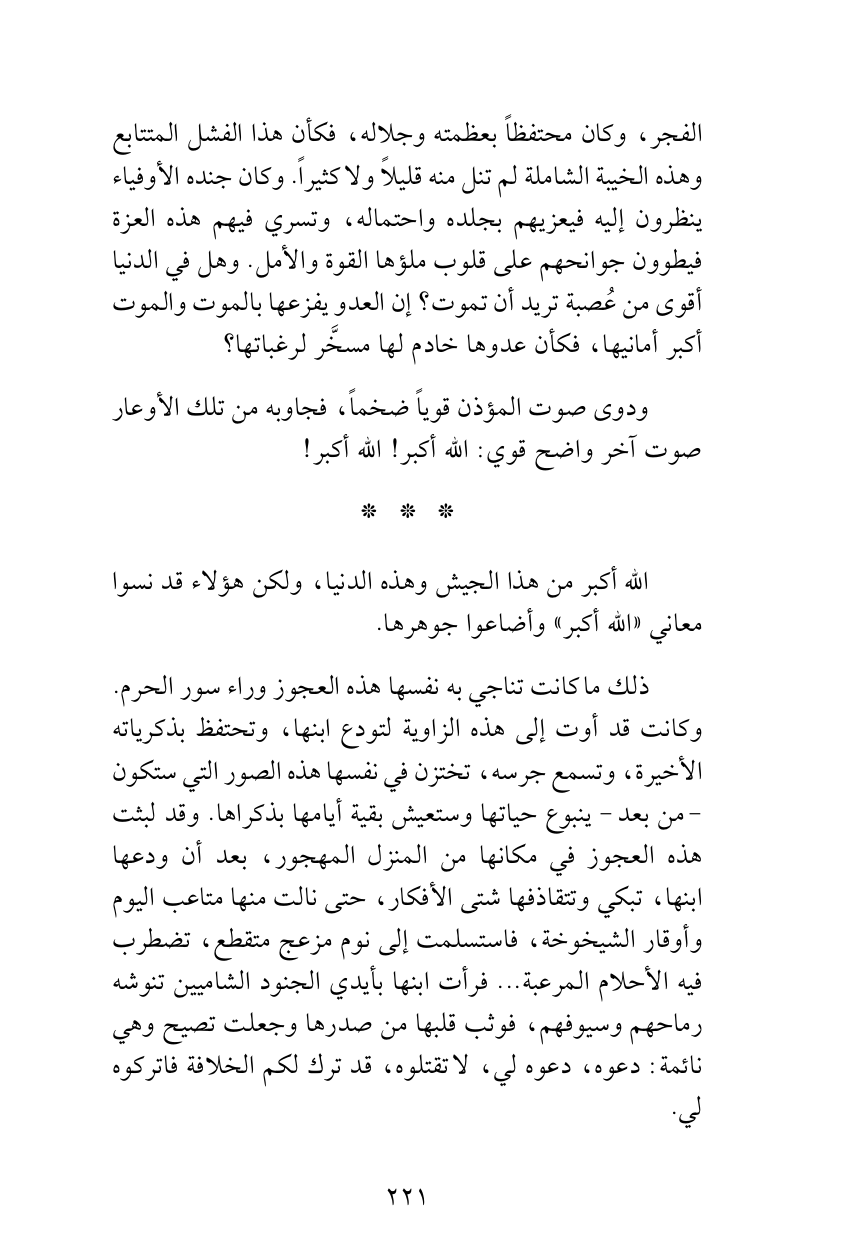 الفجر، وكان محتفظاً بعظمته وجلاله، فكأن هذا الفشل المتتابع وهذه الخيبة الشاملة لم تنل منه قليلاً ولا كثيراً. وكان جنده الأوفياء ينظرون إليه فيعزيهم بجلده واحتماله، وتسري فيهم هذه العزة فيطوون جوانحهم على قلوب ملؤها القوة والأمل. وهل في الدنيا أقوى من عُصبة تريد أن تموت؟ إن العدو يفزعها بالموت والموت أكبر أمانيها، فكأن عدوها خادم لها مسخَّر لرغباتها؟