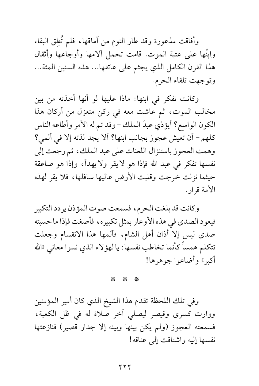 وأفاقت مذعورة وقد طار النوم من آماقها، فلم تُطِق البقاء وابنُها على عتبة الموت. قامت تحمل آلامها وأوجاعها وأثقال هذا القرن الكامل الذي يجثم على عاتقها ... هذه السنين المئة ... وتوجهت تلقاء الحرم.