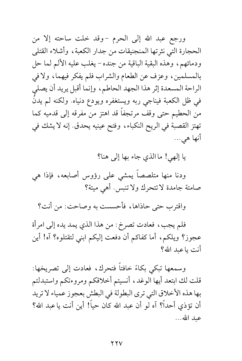 ورجع عبد الله إلى الحرم - وقد خلت ساحته إلا من الحجارة التي نثرتها المنجنيقات من جدار الكعبة، وأشلاء القتلى ودمائهم، وهذه البقية الباقية من جنده - يغلب عليه الألم لما حل بالمسلمين، وعزف عن الطعام والشراب فلم يفكر فيهما، ولا في الراحة المسعدة إثر هذا الجهد الحاطم، وإنما أقبل يريد أن يصلي في ظل الكعبة فيناجي ربه ويستغفره ويودع دنياه. ولكنه لم يدنُ من الحطيم حتى وقف مرتجفاً قد اهتز من مفرقه إلى قدميه كما تهتز القصبة في الريح النكباء، وفتح عينيه يحدق. إنه لا يشك في أنها هي ...