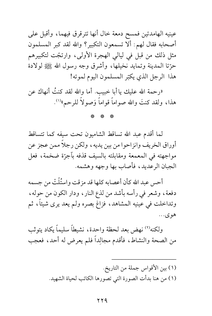 عينيه الهامدتين فمسح دمعة خال أنها تترقرق فيهما، وأقبل على أصحابه فقال لهم: ألا تسمعون التكبير؟ والله لقد كبر المسلمون مثل ذلك من قبل في ليالي الهجرة الأولى، وارتجّت لتكبيرهم حرّتا المدينة وتمايد نخيلها، وأشرق وجه رسول الله صلى الله عليه وسلم لولادة هذا الرجل الذي يكبّر المسلمون اليوم لموته!