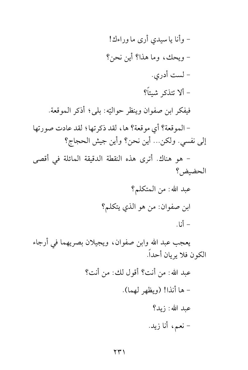 - الموقعة؟ أي موقعة؟ ها، لقد ذكرتها؛ لقد عادت صورتها إلى نفسي. ولكن ... أين نحن؟ وأين جيش الحجاج؟