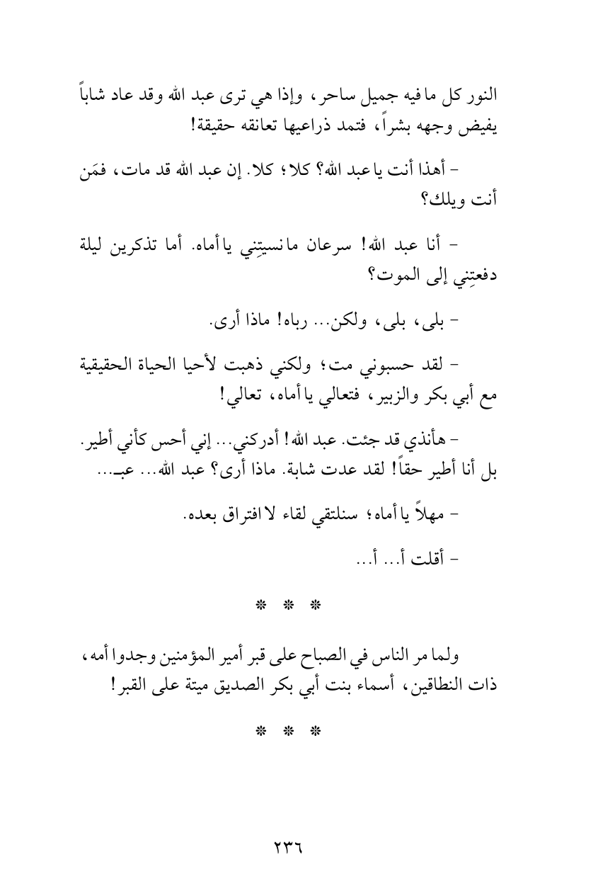 - لقد حسبوني مت؛ ولكني ذهبت لأحيا الحياة الحقيقية مع أبي بكر والزبير، فتعالي يا أماه، تعالي!