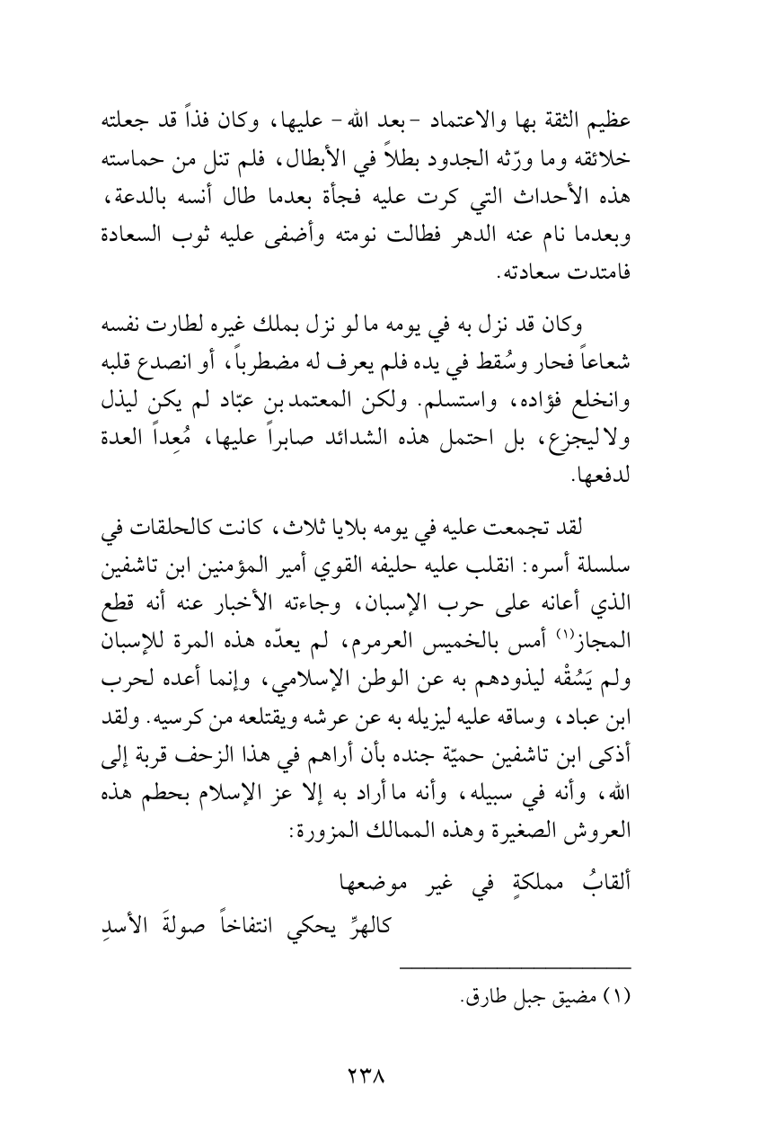 عظيم الثقة بها والاعتماد - بعد الله - عليها، وكان فذاً قد جعلته خلائقه وما ورّثه الجدود بطلاً في الأبطال، فلم تنل من حماسته هذه الأحداث التي كرت عليه فجأة بعدما طال أنسه بالدعة، وبعدما نام عنه الدهر فطالت نومته وأضفى عليه ثوب السعادة فامتدت سعادته.