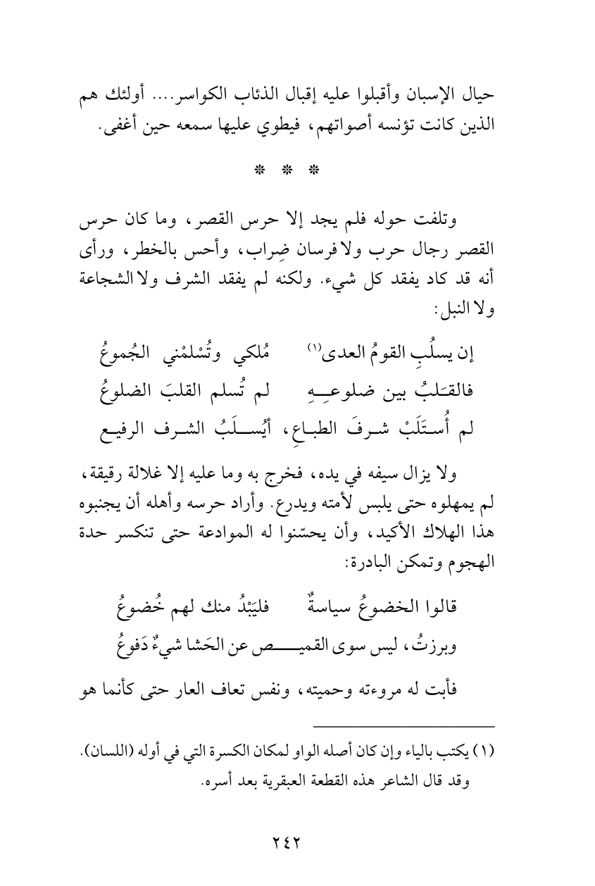 لم أُستَلَبْ شرفَ الطباعِ، ... أيُسلَبُ الشرف الرفيع