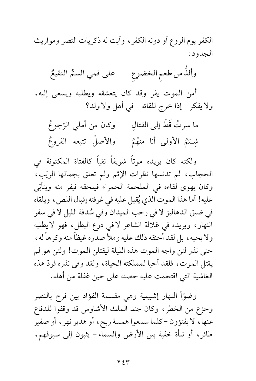 ولكنه كان يريده موتاً شريفاً نقياً كالفتاة المكنونة في الحجاب، لم تدنسها نظرات الإثم ولم تعلق بجمالها الريَب، وكان يهوى لقاءه في الملحمة الحمراء فيلحقه فيفر منه ويتأبّى عليه! أما هذا الموت الذي يُقبل عليه في غرفته إقبال اللص، ويلقاه في ضيق الدهاليز لا في رحب الميدان وفي سُدْفة الليل لا في سفر النهار، ويريده في غلالة الشاعر لا في درع البطل، فهو لا يطلبه ولا يحبه، بل لقد أحنقه ذلك عليه وملأ صدره غيظاً منه وكرهاً له، حتى نذر لئن واجه الموت هذه الليلة ليقتلن الموت! ولئن هو لم يقتل الموت، فلقد أحيا لمملكته الحياة، ولقد وفى نذره فردّ هذه الغاشية التي اقتحمت عليه حصنه على حين غفلة من أهله.