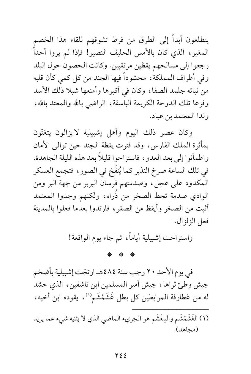يتطلعون أبداً إلى الطرق من فرط تشوقهم للقاء هذا الخصم المغير، الذي كان بالأمس الحليف النصير! فإذا لم يروا أحداً رجعوا إلى مسالحهم يقظين مرتقبين. وكانت الحصون حول البلد وفي أطراف المملكة، محشوداً فيها الجند من كل كمي كأن قلبه من ثباته جلمد الصفا، وكان في أكبرها وأمنعها شبلا ذلك الأسد وفرعا تلك الدوحة الكريمة الباسقة، الراضي بالله والمعتد بالله، ولدا المعتمد بن عباد.