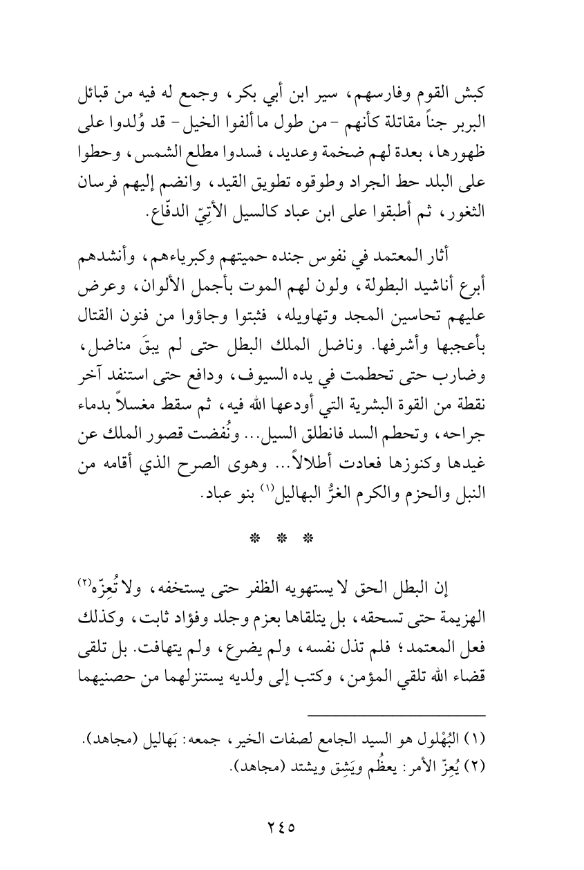 أثار المعتمد في نفوس جنده حميتهم وكبرياءهم، وأنشدهم أبرع أناشيد البطولة، ولون لهم الموت بأجمل الألوان، وعرض عليهم تحاسين المجد وتهاويله، فثبتوا وجاؤوا من فنون القتال بأعجبها وأشرفها. وناضل الملك البطل حتى لم يبقَ مناضل، وضارب حتى تحطمت في يده السيوف، ودافع حتى استنفد آخر نقطة من القوة البشرية التي أودعها الله فيه، ثم سقط مغسلاً بدماء جراحه، وتحطم السد فانطلق السيل ... ونُفضت قصور الملك عن غيدها وكنوزها فعادت أطلالاً ... وهوى الصرح الذي أقامه من النبل والحزم والكرم الغرُّ البهاليل (¬1) بنو عباد.