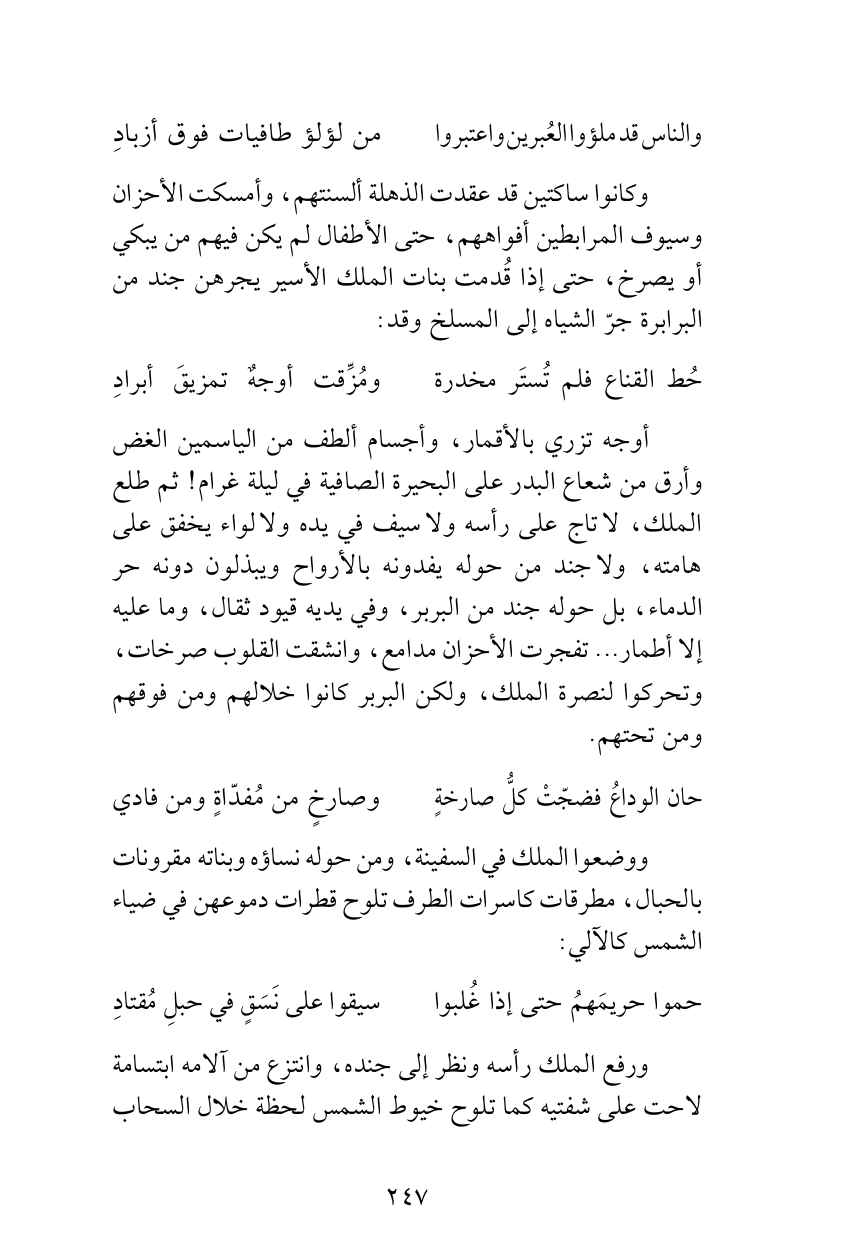 وكانوا ساكتين قد عقدت الذهلة ألسنتهم، وأمسكت الأحزان وسيوف المرابطين أفواههم، حتى الأطفال لم يكن فيهم من يبكي أو يصرخ، حتى إذا قُدمت بنات الملك الأسير يجرهن جند من البرابرة جرّ الشياه إلى المسلخ وقد:
