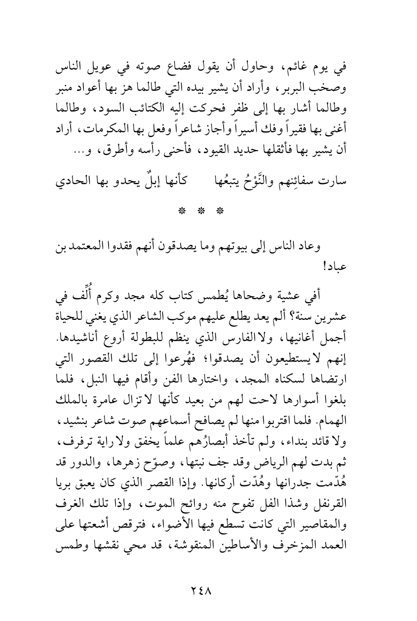 أفي عشية وضحاها يُطمس كتاب كله مجد وكرم أُلِّف في عشرين سنة؟ ألم يعد يطلع عليهم موكب الشاعر الذي يغني للحياة أجمل أغانيها، ولا الفارس الذي ينظم للبطولة أروع أناشيدها. إنهم لا يستطيعون أن يصدقوا؛ فهُرعوا إلى تلك القصور التي ارتضاها لسكناه المجد، واختارها الفن وأقام فيها النبل، فلما بلغوا أسوارها لاحت لهم من بعيد كأنها لا تزال عامرة بالملك الهمام. فلما اقتربوا منها لم يصافح أسماعهم صوت شاعر بنشيد، ولا قائد بنداء، ولم تأخذ أبصارُهم علماً يخفق ولا راية ترفرف، ثم بدت لهم الرياض وقد جف نبتها، وصوّح زهرها، والدور قد هُدّمت جدرانها وهُدّت أركانها. وإذا القصر الذي كان يعبق بريا القرنفل وشذا الفل تفوح منه روائح الموت، وإذا تلك الغرف والمقاصير التي كانت تسطع فيها الأضواء، فترقص أشعتها على العمد المزخرف والأساطين المنقوشة، قد محي نقشها وطمس