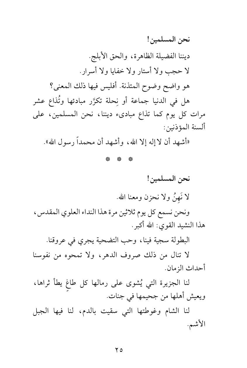 هل في الدنيا جماعة أو نِحلة تكرَّر مبادئها وتُذاع عشر مرات كل يوم كما تذاع مبادىء ديننا، نحن المسلمين، على ألسنة المؤذنين: