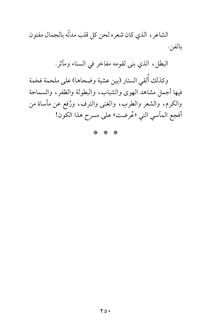 وكذلك أُلقي الستار (بين عشية وضحاها) على ملحمة فخمة فيها أجمل مشاهد الهوى والشباب، والبطولة والظفر، والسماحة والكرم، والشعر والطرب، والغنى والترف، ورُفع عن مأساة من أفجع المآسي التي «عُرضت» على مسرح هذا الكون!