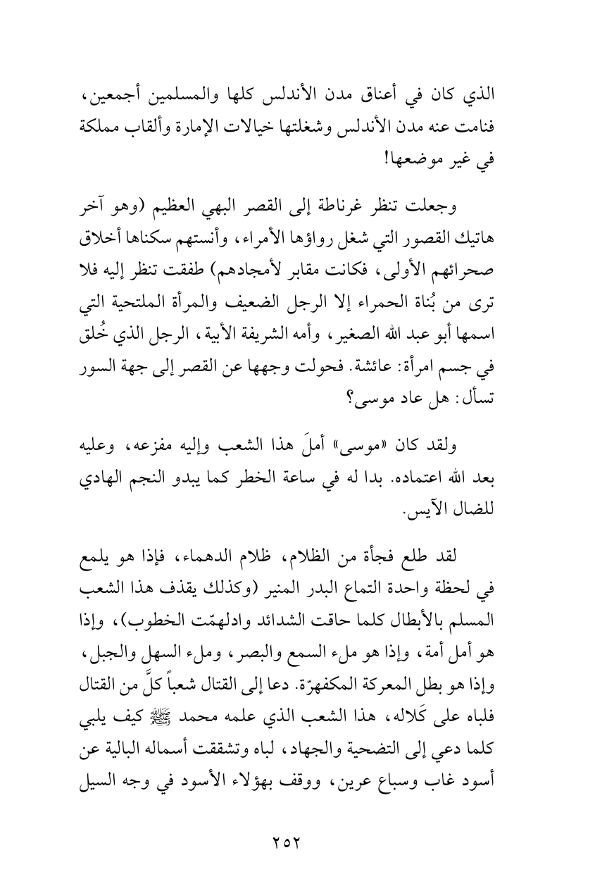 وجعلت تنظر غرناطة إلى القصر البهي العظيم (وهو آخر هاتيك القصور التي شغل رواؤها الأمراء، وأنستهم سكناها أخلاق صحرائهم الأولى، فكانت مقابر لأمجادهم) طفقت تنظر إليه فلا ترى من بُناة الحمراء إلا الرجل الضعيف والمرأة الملتحية التي اسمها أبو عبد الله الصغير، وأمه الشريفة الأبية، الرجل الذي خُلق في جسم امرأة: عائشة. فحولت وجهها عن القصر إلى جهة السور تسأل: هل عاد موسى؟