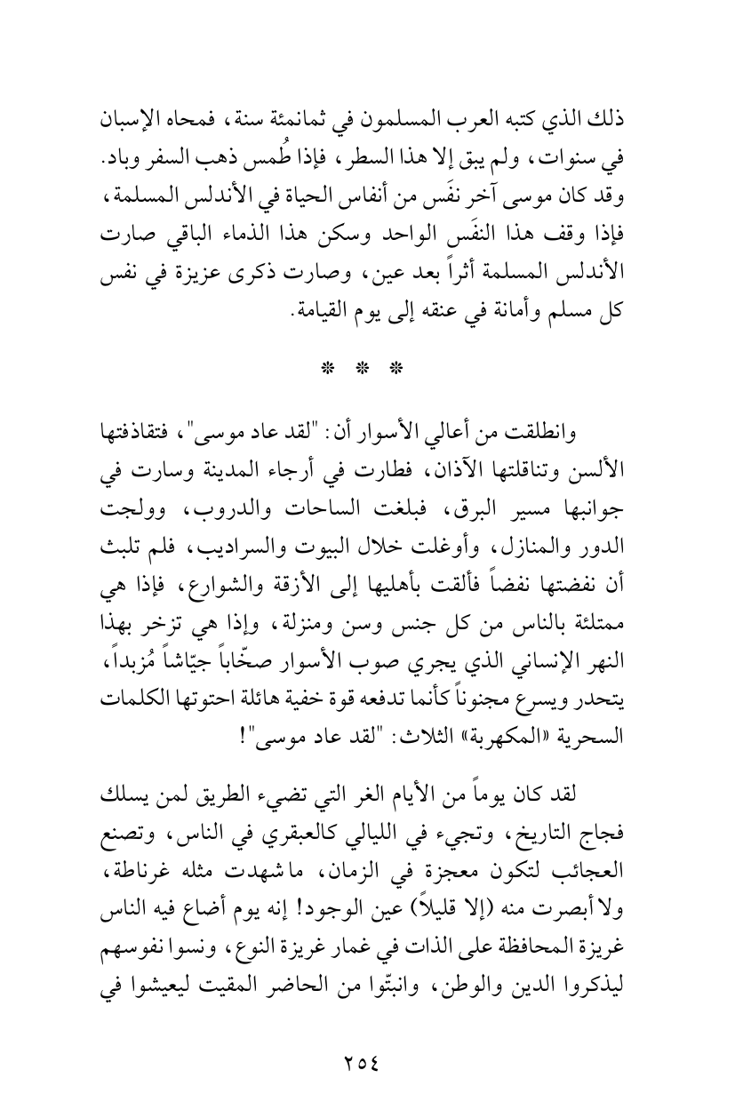 ذلك الذي كتبه العرب المسلمون في ثمانمئة سنة، فمحاه الإسبان في سنوات، ولم يبق إلا هذا السطر، فإذا طُمس ذهب السفر وباد. وقد كان موسى آخر نفَس من أنفاس الحياة في الأندلس المسلمة، فإذا وقف هذا النفَس الواحد وسكن هذا الذماء الباقي صارت الأندلس المسلمة أثراً بعد عين، وصارت ذكرى عزيزة في نفس كل مسلم وأمانة في عنقه إلى يوم القيامة.