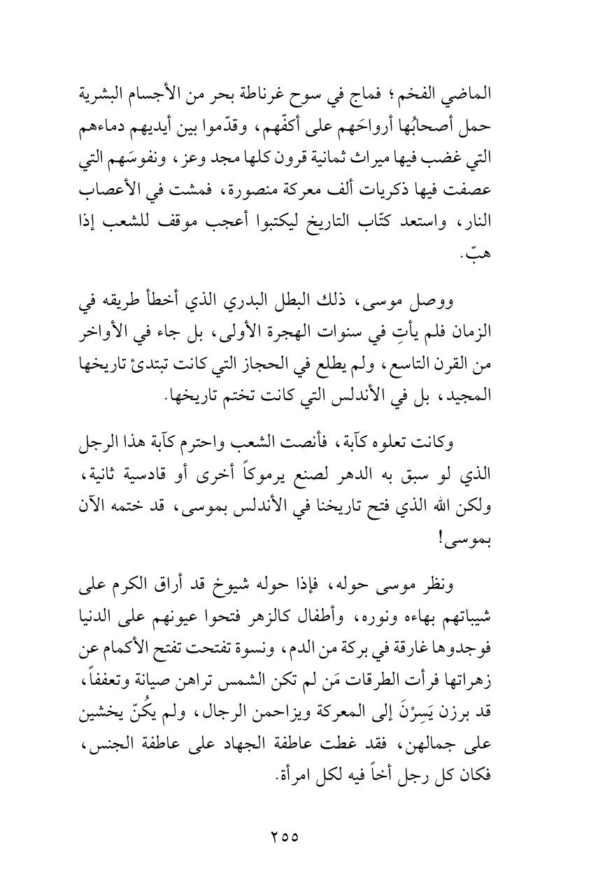 وكانت تعلوه كآبة، فأنصت الشعب واحترم كآبة هذا الرجل الذي لو سبق به الدهر لصنع يرموكاً أخرى أو قادسية ثانية، ولكن الله الذي فتح تاريخنا في الأندلس بموسى، قد ختمه الآن بموسى!