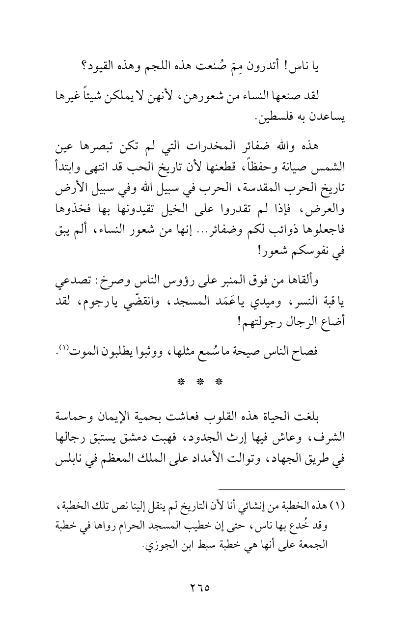هذه والله ضفائر المخدرات التي لم تكن تبصرها عين الشمس صيانة وحفظاً، قطعنها لأن تاريخ الحب قد انتهى وابتدأ تاريخ الحرب المقدسة، الحرب في سبيل الله وفي سبيل الأرض والعرض، فإذا لم تقدروا على الخيل تقيدونها بها فخذوها فاجعلوها ذوائب لكم وضفائر ... إنها من شعور النساء، ألم يبق في نفوسكم شعور!