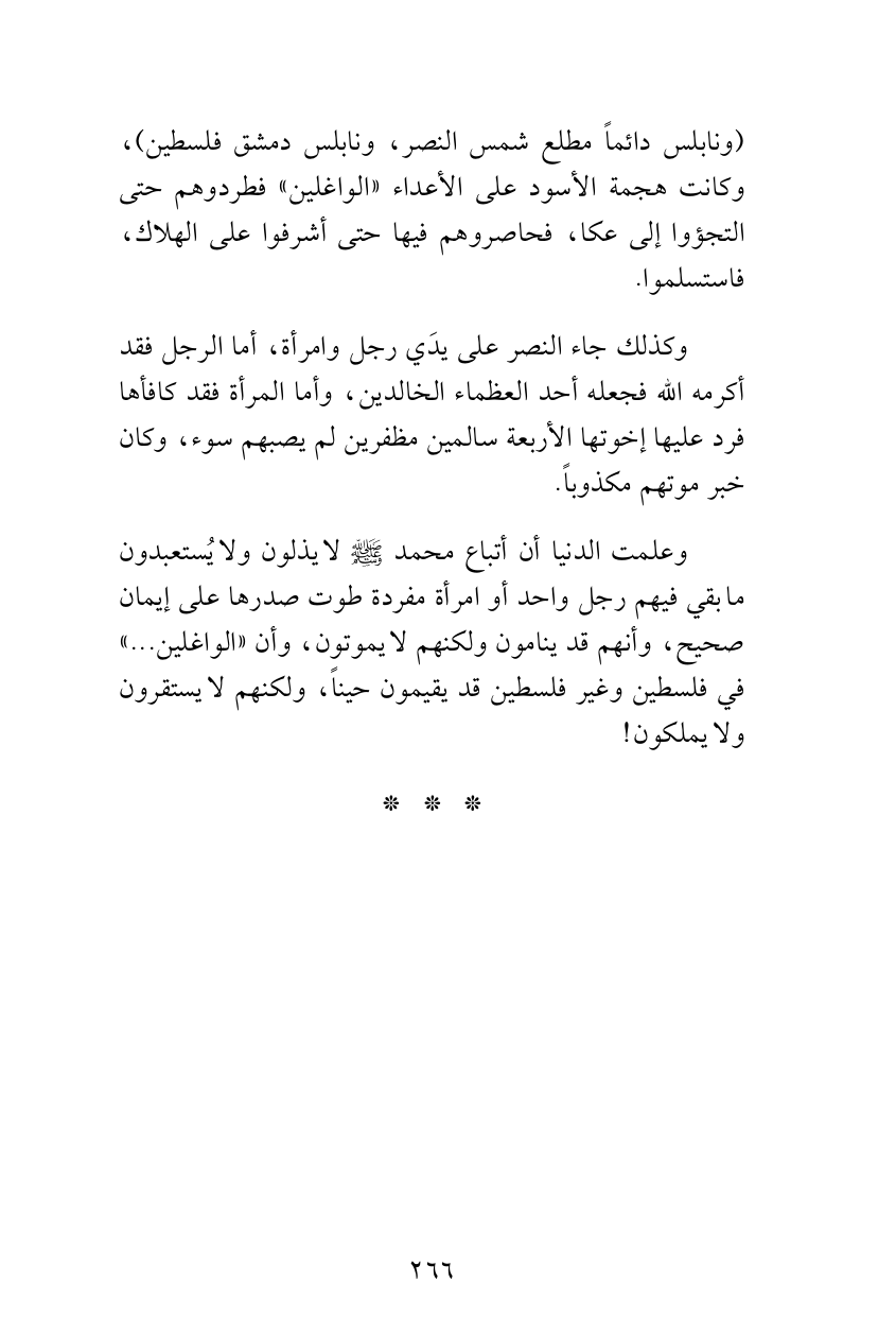 وعلمت الدنيا أن أتباع محمد صلى الله عليه وسلم لا يذلون ولا يُستعبدون ما بقي فيهم رجل واحد أو امرأة مفردة طوت صدرها على إيمان صحيح، وأنهم قد ينامون ولكنهم لا يموتون، وأن «الواغلين ...» في فلسطين وغير فلسطين قد يقيمون حيناً، ولكنهم لا يستقرون ولا يملكون!
