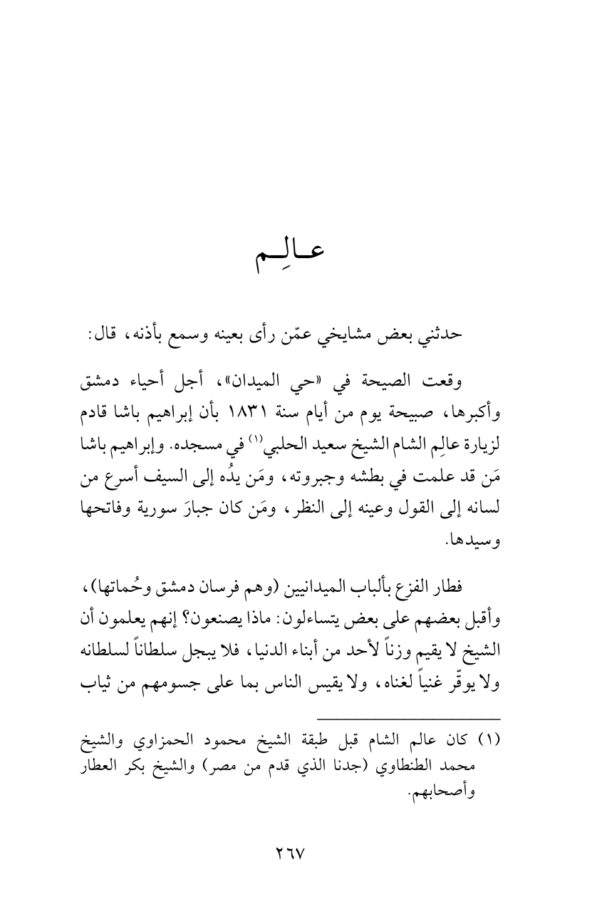 وقعت الصيحة في «حي الميدان»، أجل أحياء دمشق وأكبرها، صبيحة يوم من أيام سنة 1831 بأن إبراهيم باشا قادم لزيارة عالِم الشام الشيخ سعيد الحلبي (¬1) في مسجده. وإبراهيم باشا مَن قد علمت في بطشه وجبروته، ومَن يدُه إلى السيف أسرع من لسانه إلى القول وعينه إلى النظر، ومَن كان جبارَ سورية وفاتحها وسيدها.