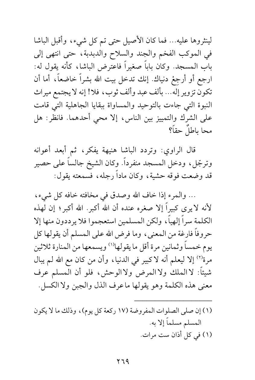 لينثروها عليه ... فما كان الأصيل حتى تم كل شيء، وأقبل الباشا في الموكب الفخم والجند والسلاح والدبدبة، حتى انتهى إلى باب المسجد. وكان باباً صغيراً فاعترض الباشا، كأنه يقول له: ارجع أو أرجِعْ دنياك. إنك تدخل بيت الله بشراً خاضعاً، أما أن تكون تزوير إله ... بألف عبد وألف ثوب، فلا! إنه لا يجتمع ميراث النبوة التي جاءت بالتوحيد والمساواة ببقايا الجاهلية التي قامت على الشرك والتمييز بين الناس، إلا محي أحدهما. فانظر: هل محا باطلٌ حقاً؟